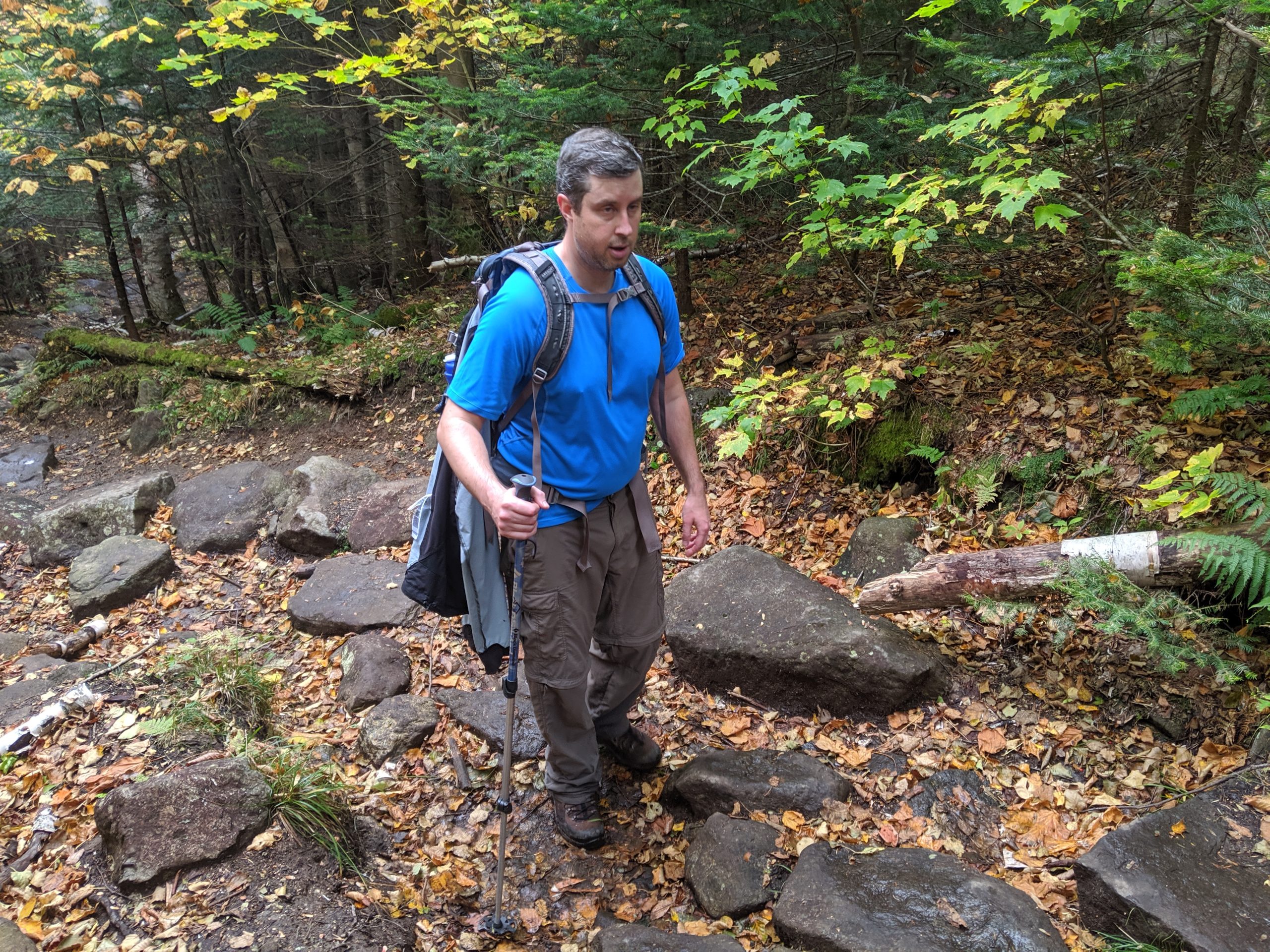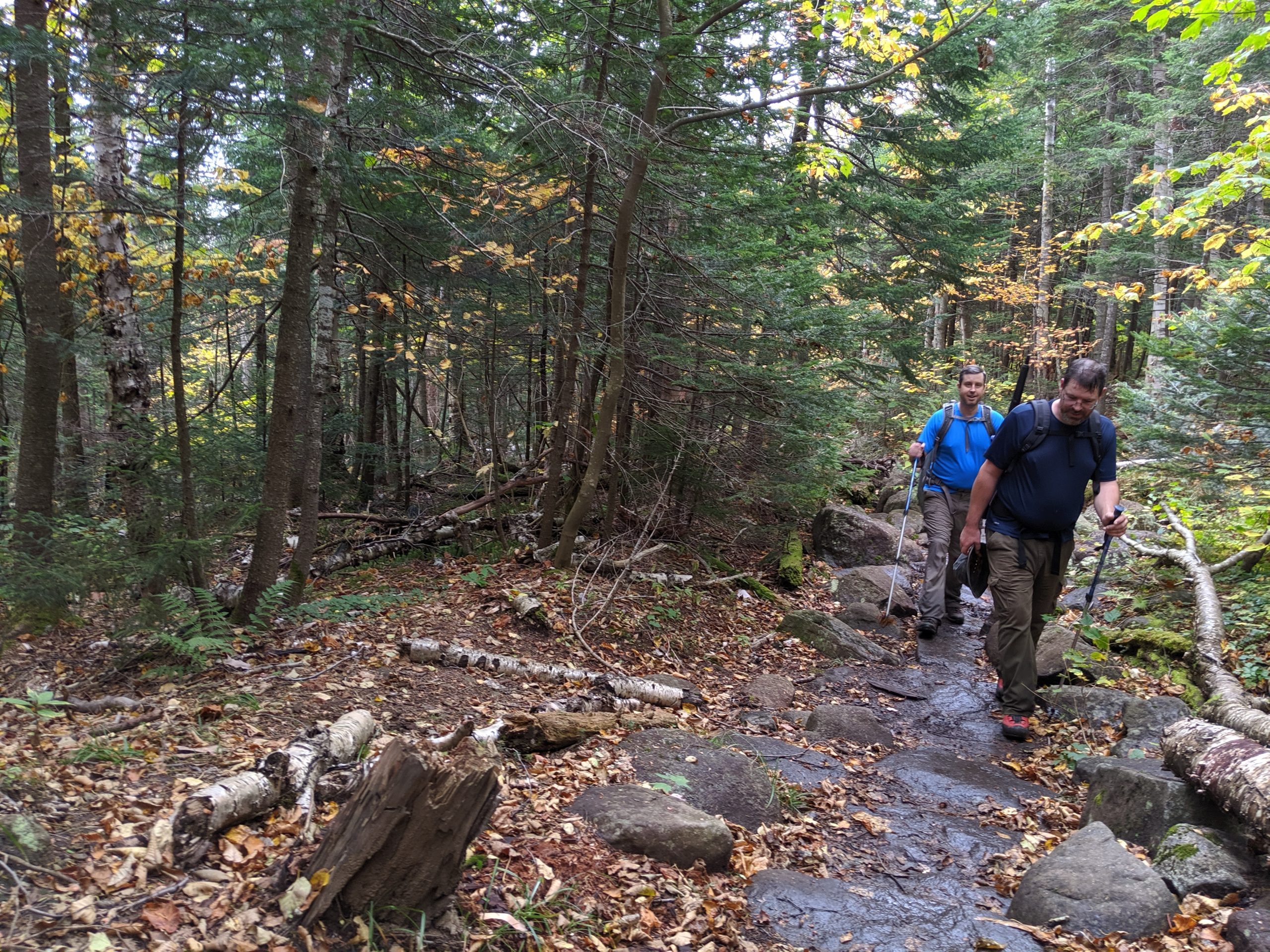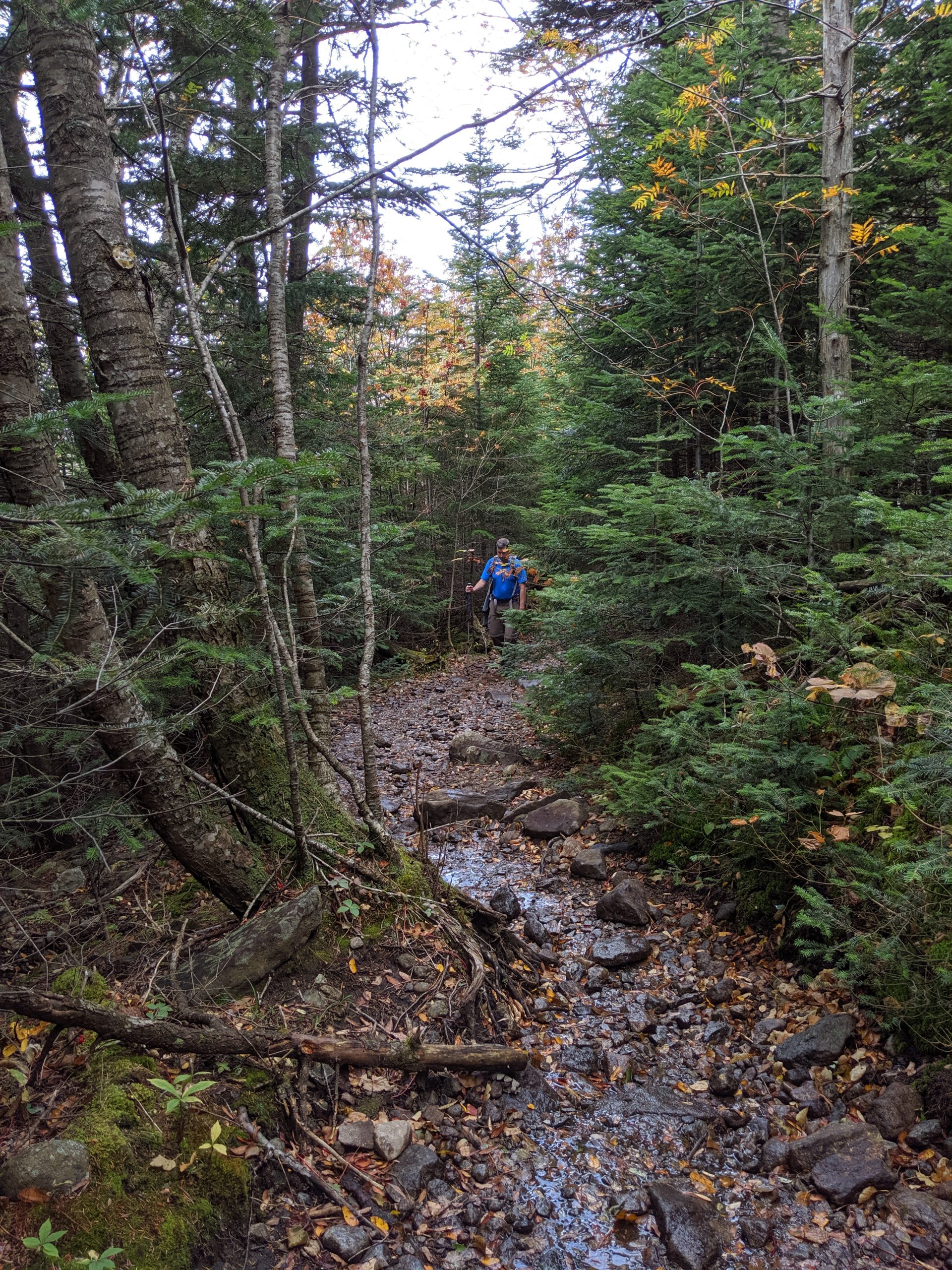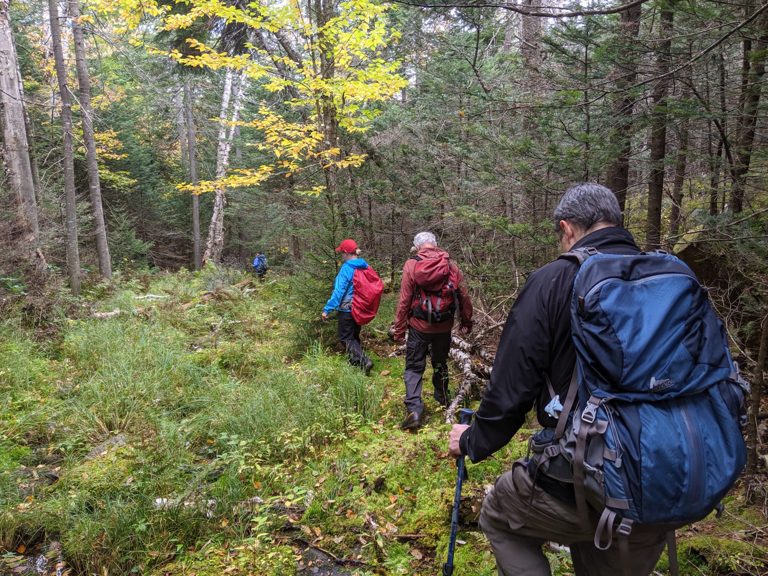 A group trip from Meadows Lane to Adirondack Loj, with a detour up the Whales Tail ski trail. This I do not recommend, the ski trails are extra wet during the fall months. The advantage this does give you is that obtaining drinking water is trivial; assuming you brought along a filter or treatment tools; which on this trip we did not and it did present some challenges on the way back down.