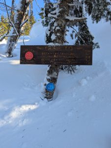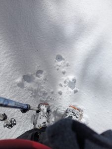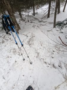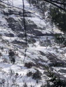 Day one was up to the Lean-To, then a late start up to the Summit.. well Summit ridge. Things were softening up and water crossings were punching through. The ‘ladder’ up beside the slide was fairly solid (thankfully, it can be very very hard in deep powder conditions which we’ve experienced in the past). I also decided to bring all my gear to the top; in retrospect I should have left most of it at the lean-to because once you’re up on the ridge you’re pushing through dense brush with softening conditions are the weight holds you down.