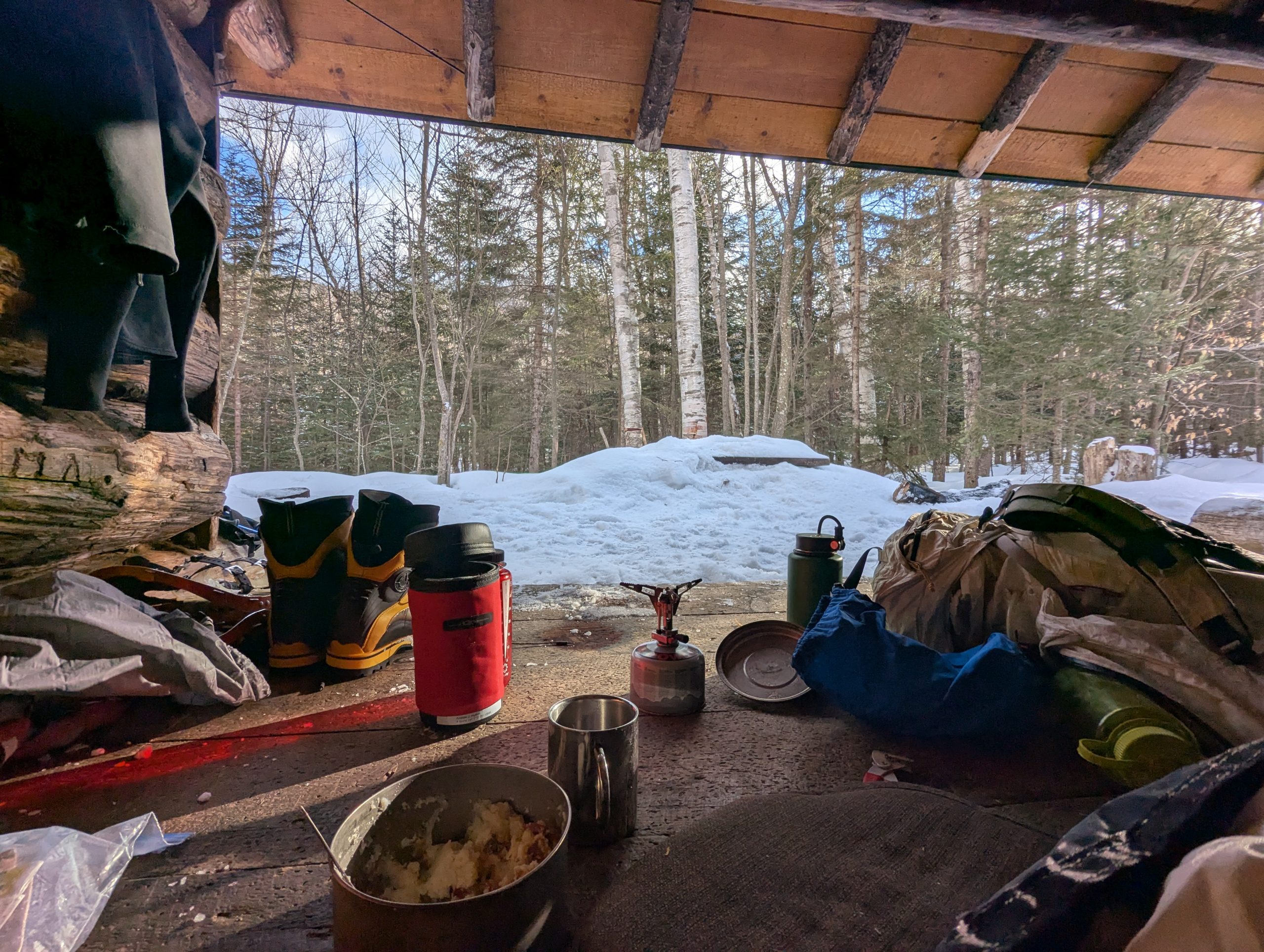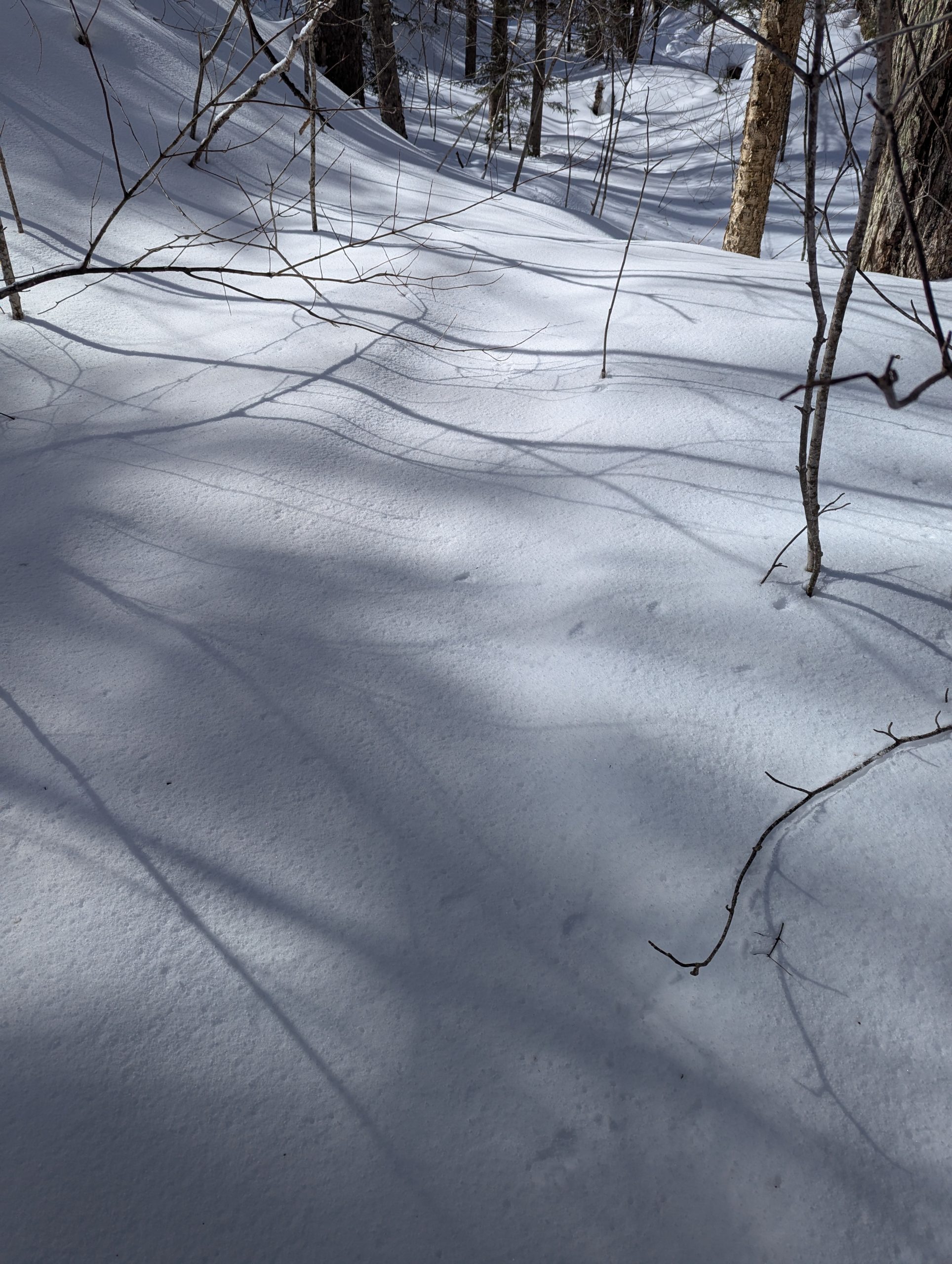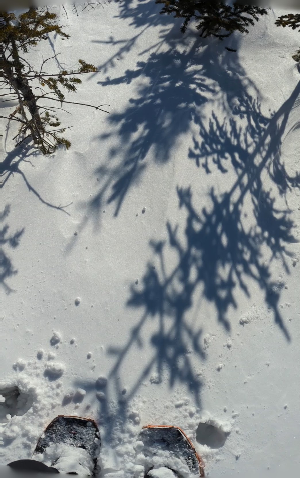 Day one was up to the Lean-To, then a late start up to the Summit.. well Summit ridge. Things were softening up and water crossings were punching through. The ‘ladder’ up beside the slide was fairly solid (thankfully, it can be very very hard in deep powder conditions which we’ve experienced in the past). I also decided to bring all my gear to the top; in retrospect I should have left most of it at the lean-to because once you’re up on the ridge you’re pushing through dense brush with softening conditions are the weight holds you down.