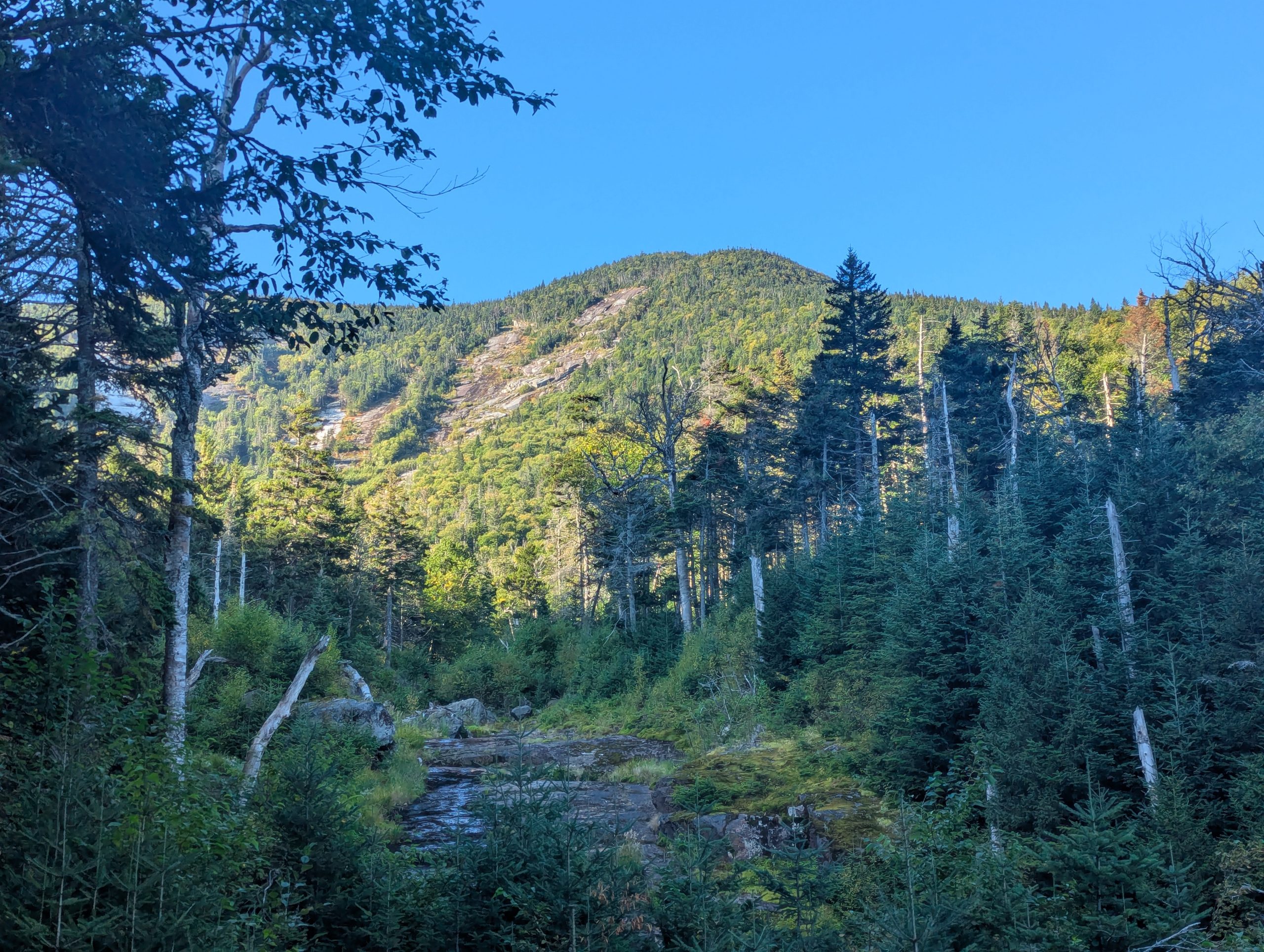 The ridge toward Armstrong was exactly the sort of mixed terrain the Great Range is known for—short descents into tight forest, then sudden openings onto bedrock and roots. Armstrong’s summit, while less dramatic than Gothics, still offered good visibility and an easy place to recover, snack and let your socks dry out a bit before continuing. The trail was in excellent condition.