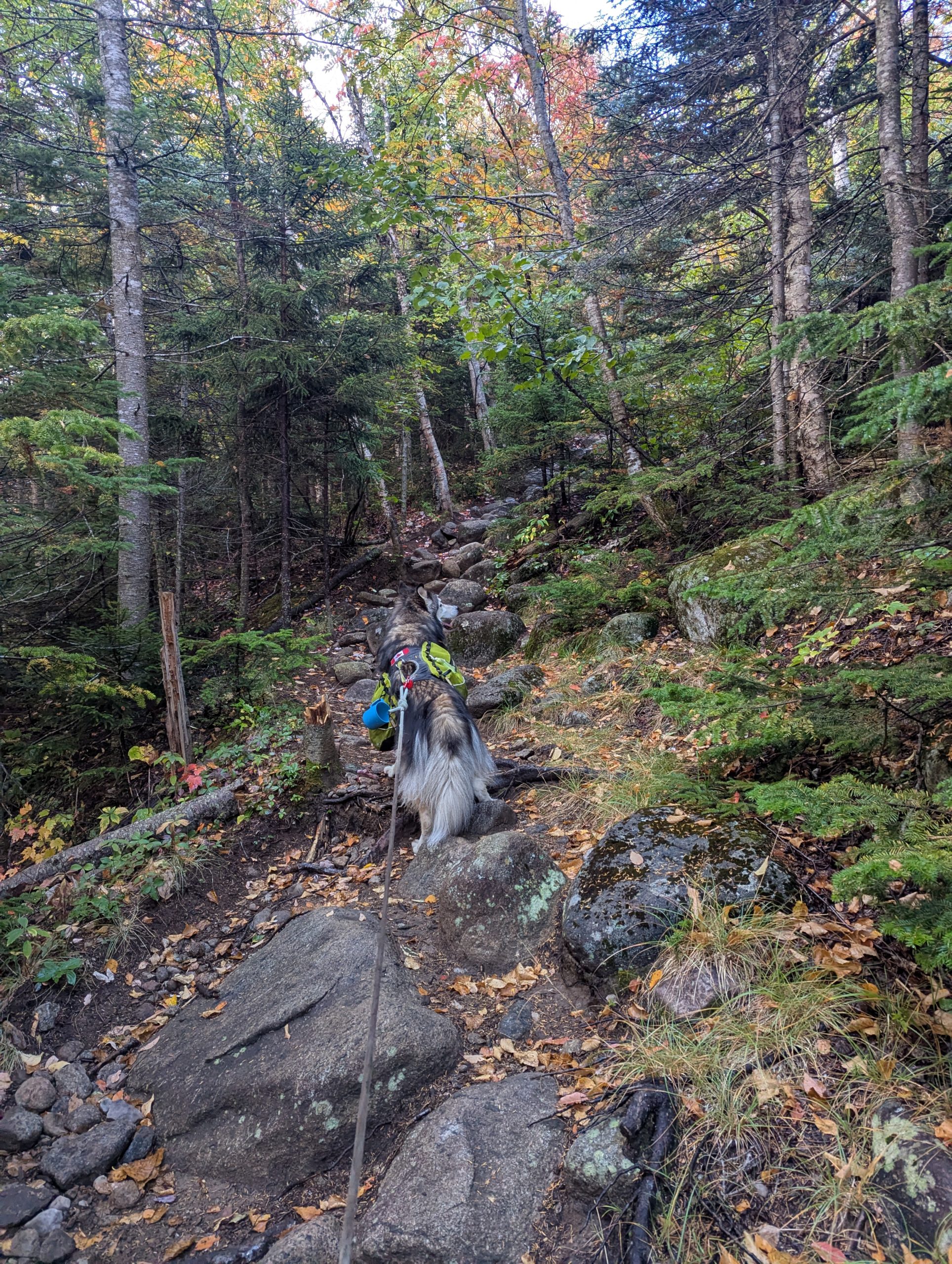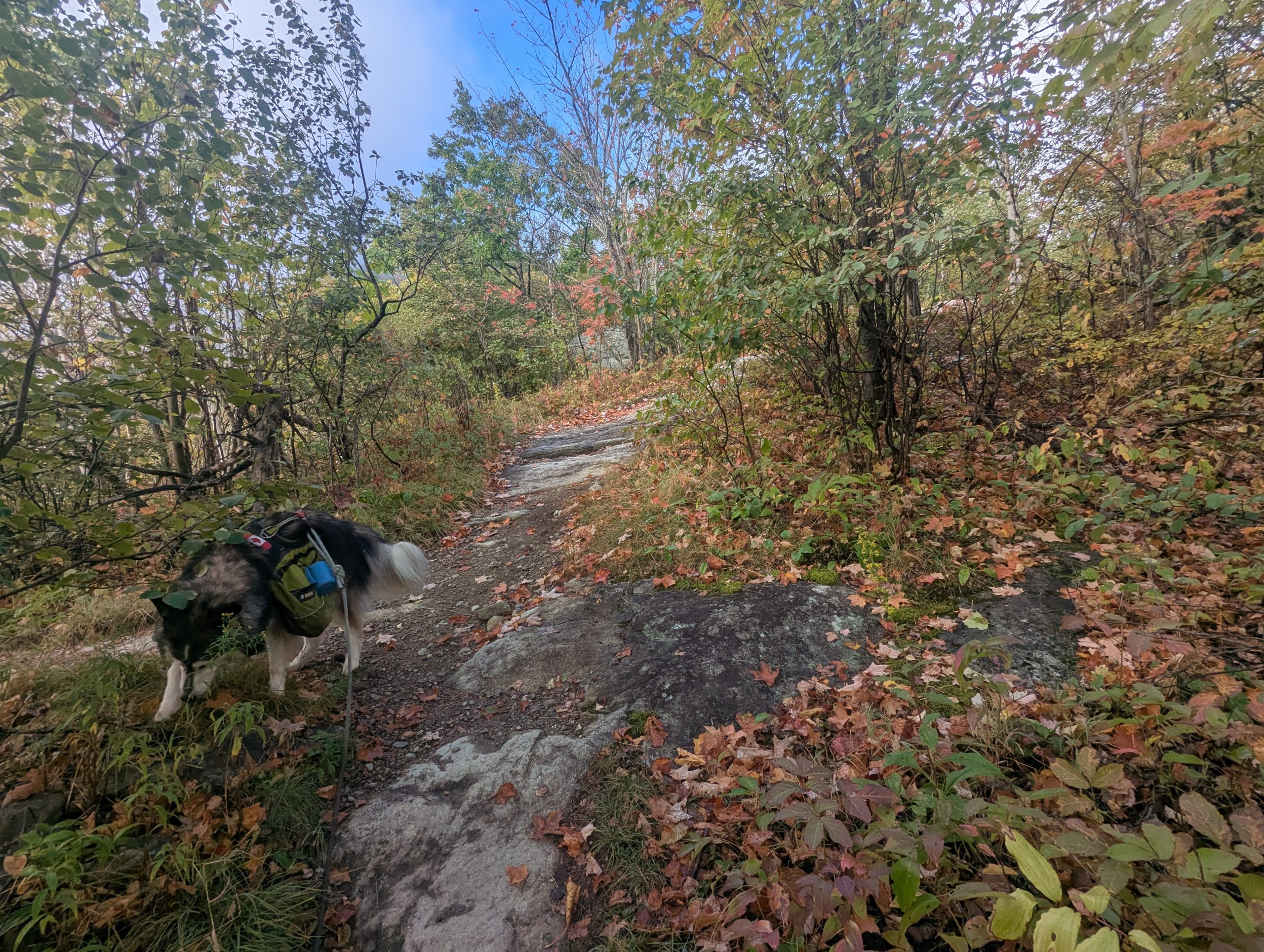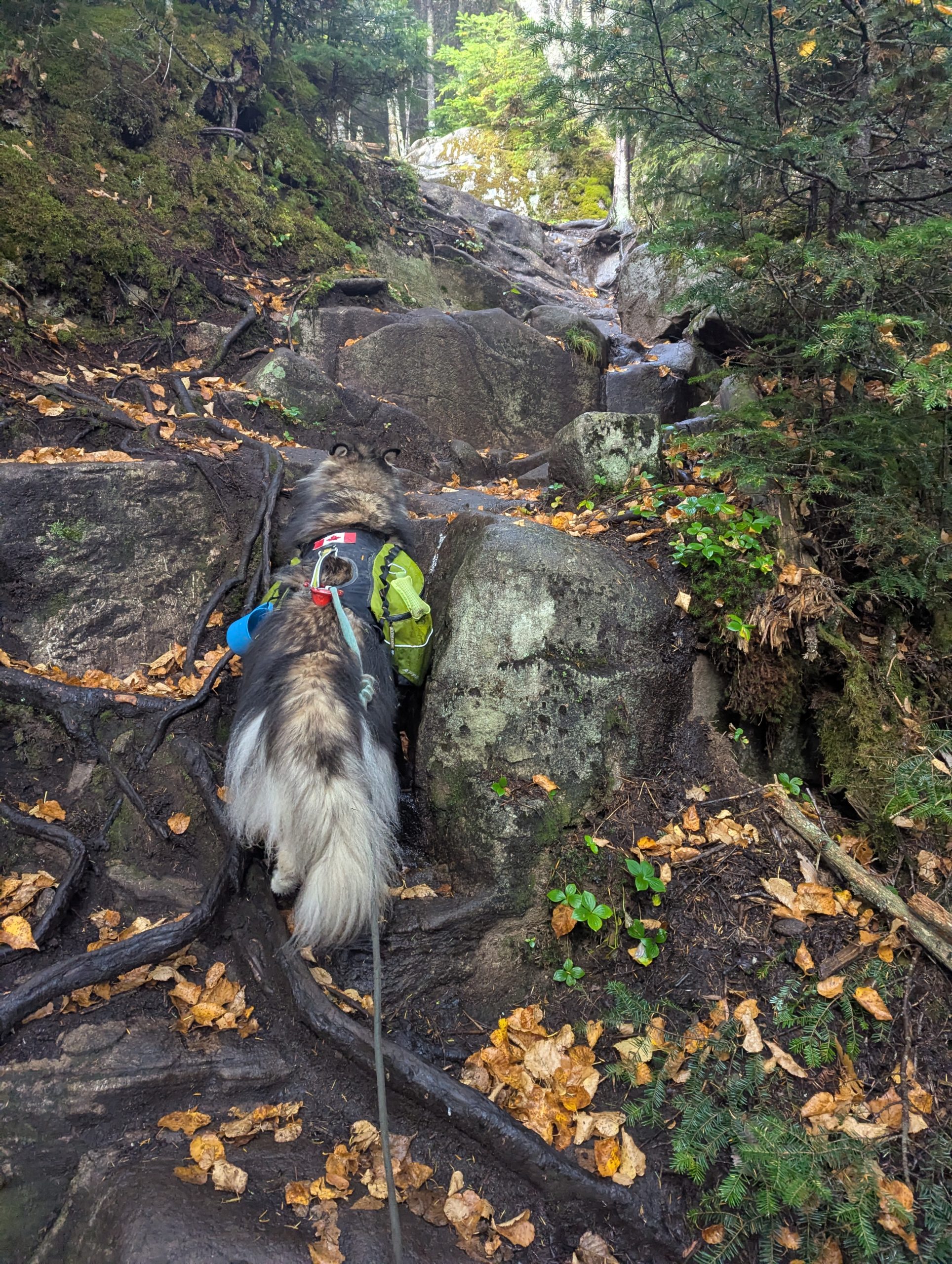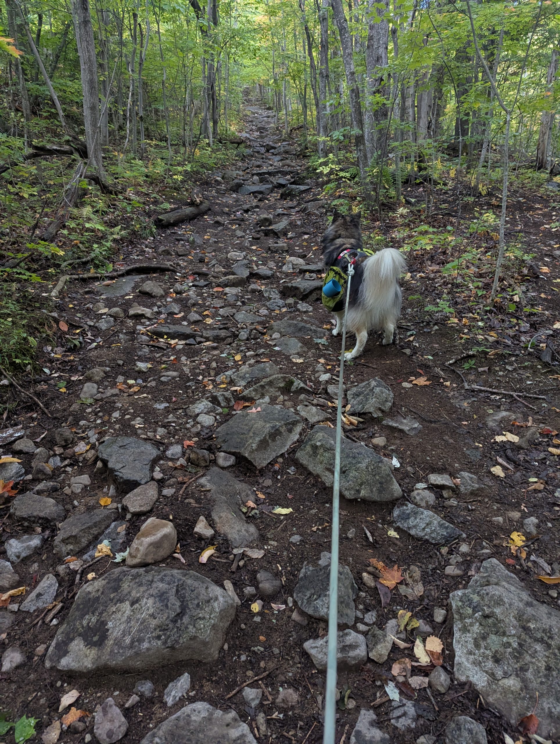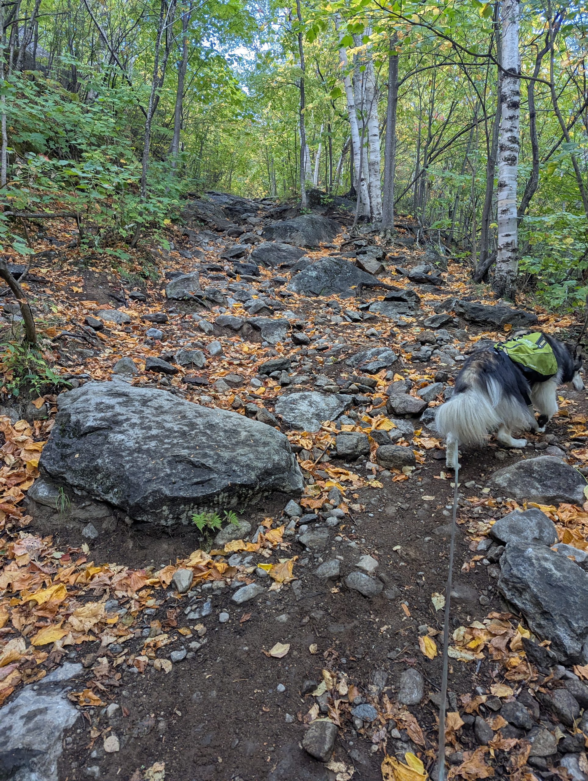 Once back at the junction we turned uphill towards Whiteface, had an interesting time getting around some blow down but soon enough we began crossing cut areas where the resort has cut up and across the trail, then passed the top end of one of the chair lifts before heading back into stacked boulders. Jasper isn’t a fan of this kind of terrain but with some boosts he made it through until we passed under the embankment for the toll road. We decided to take the road around the final section.
