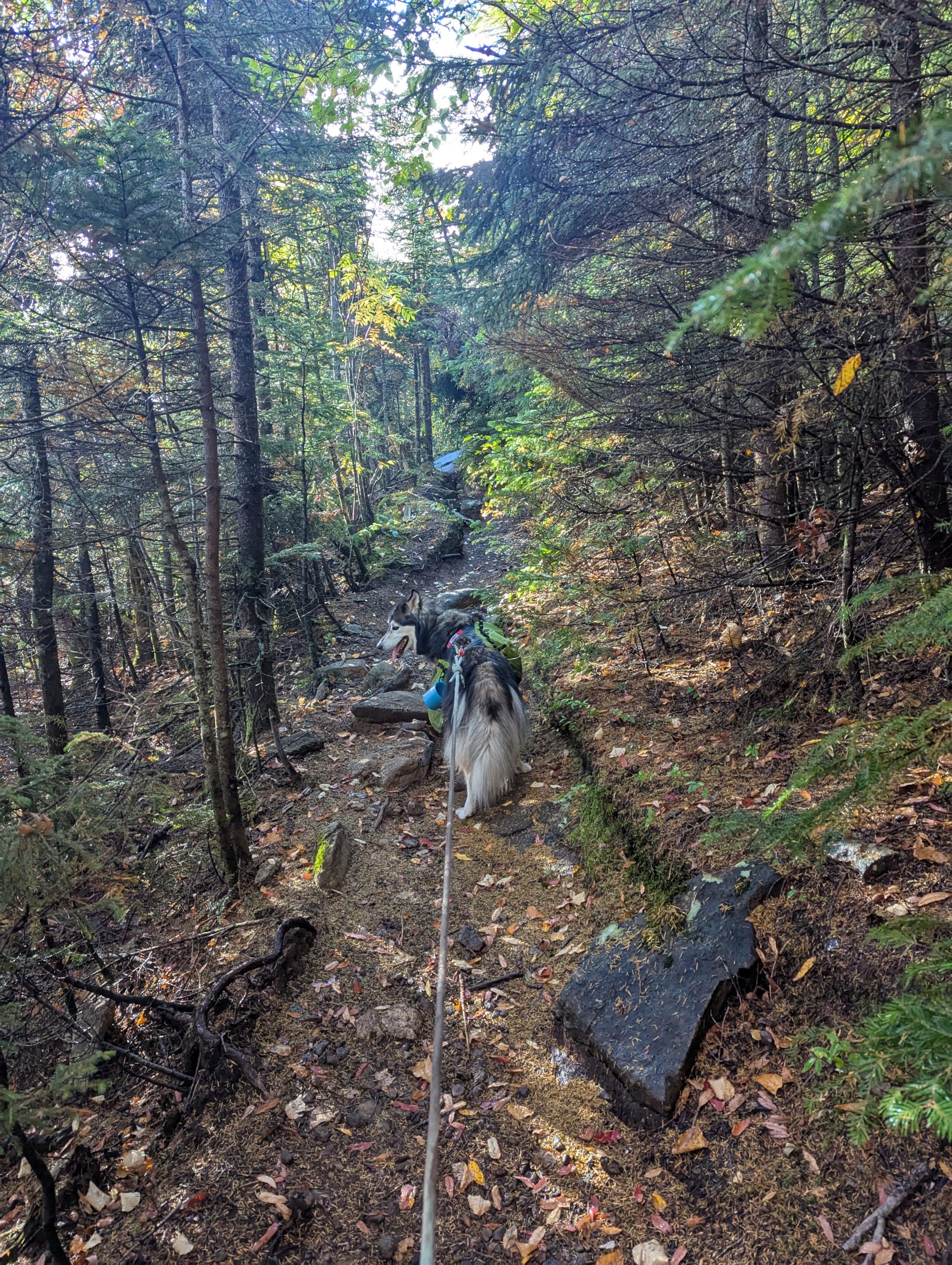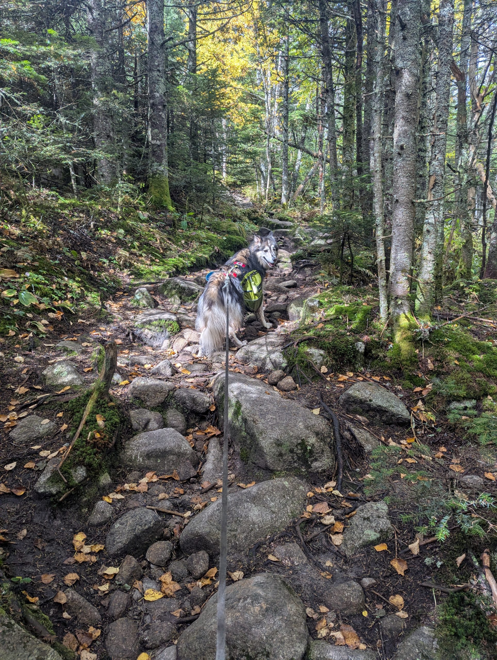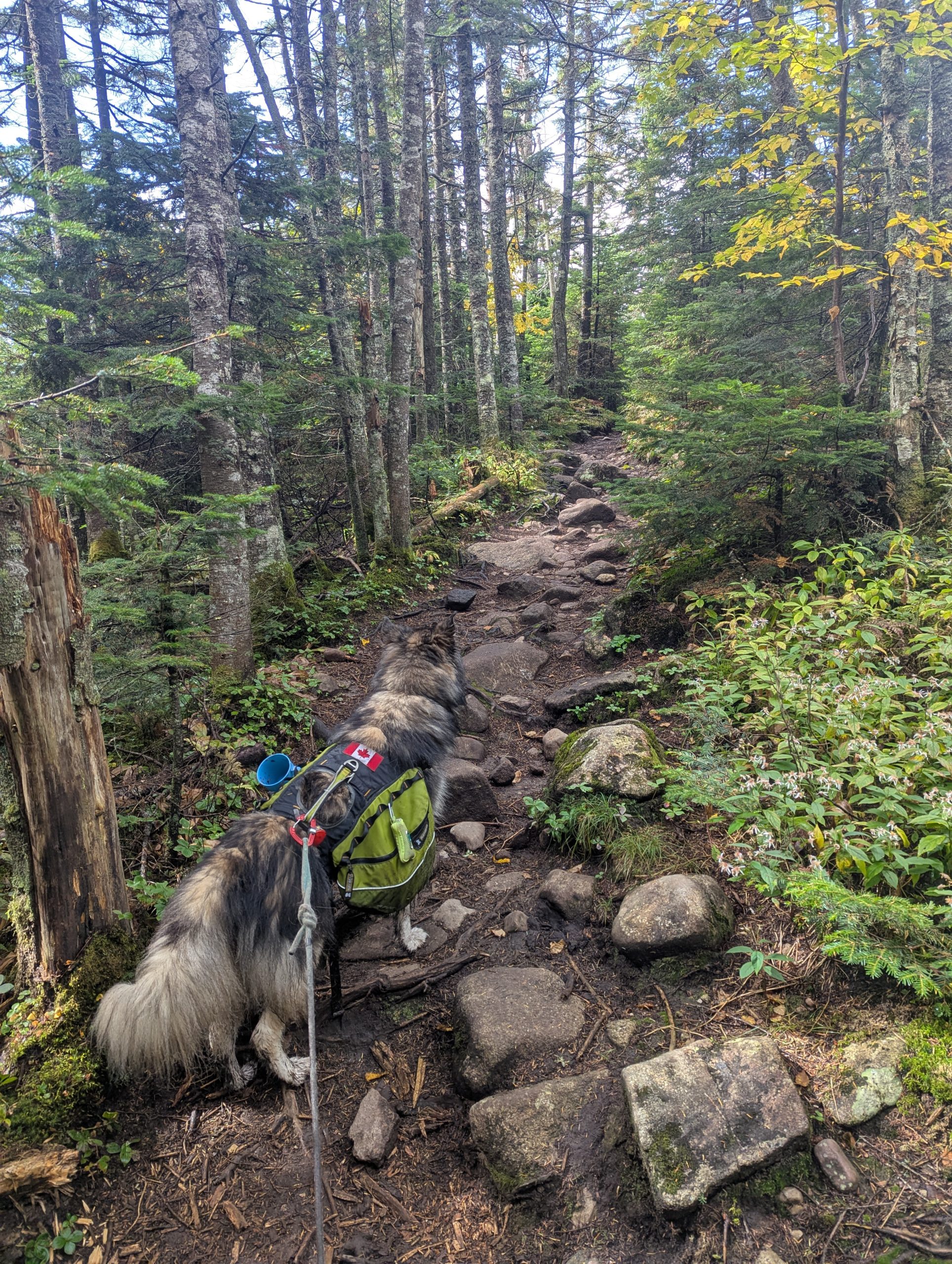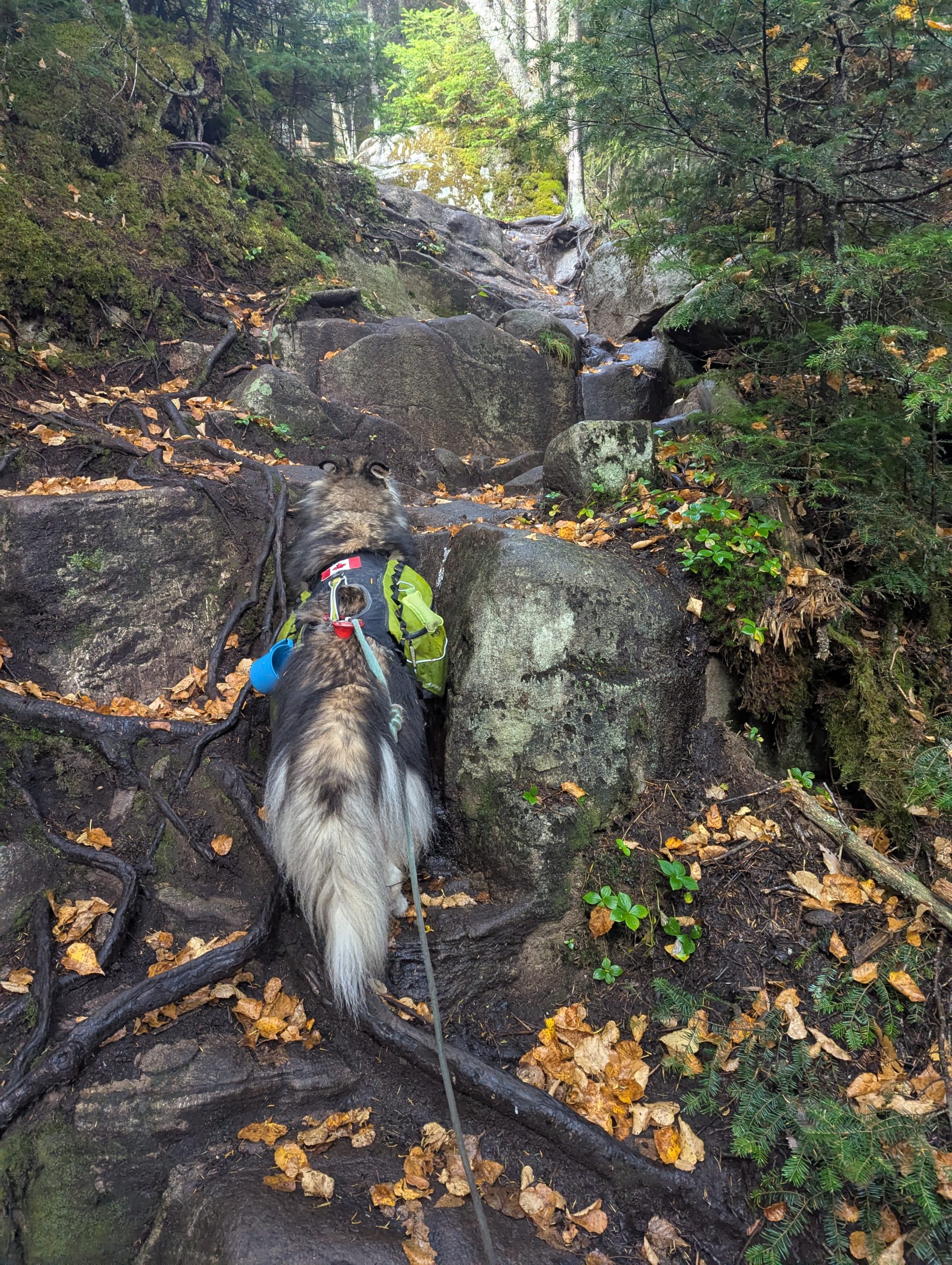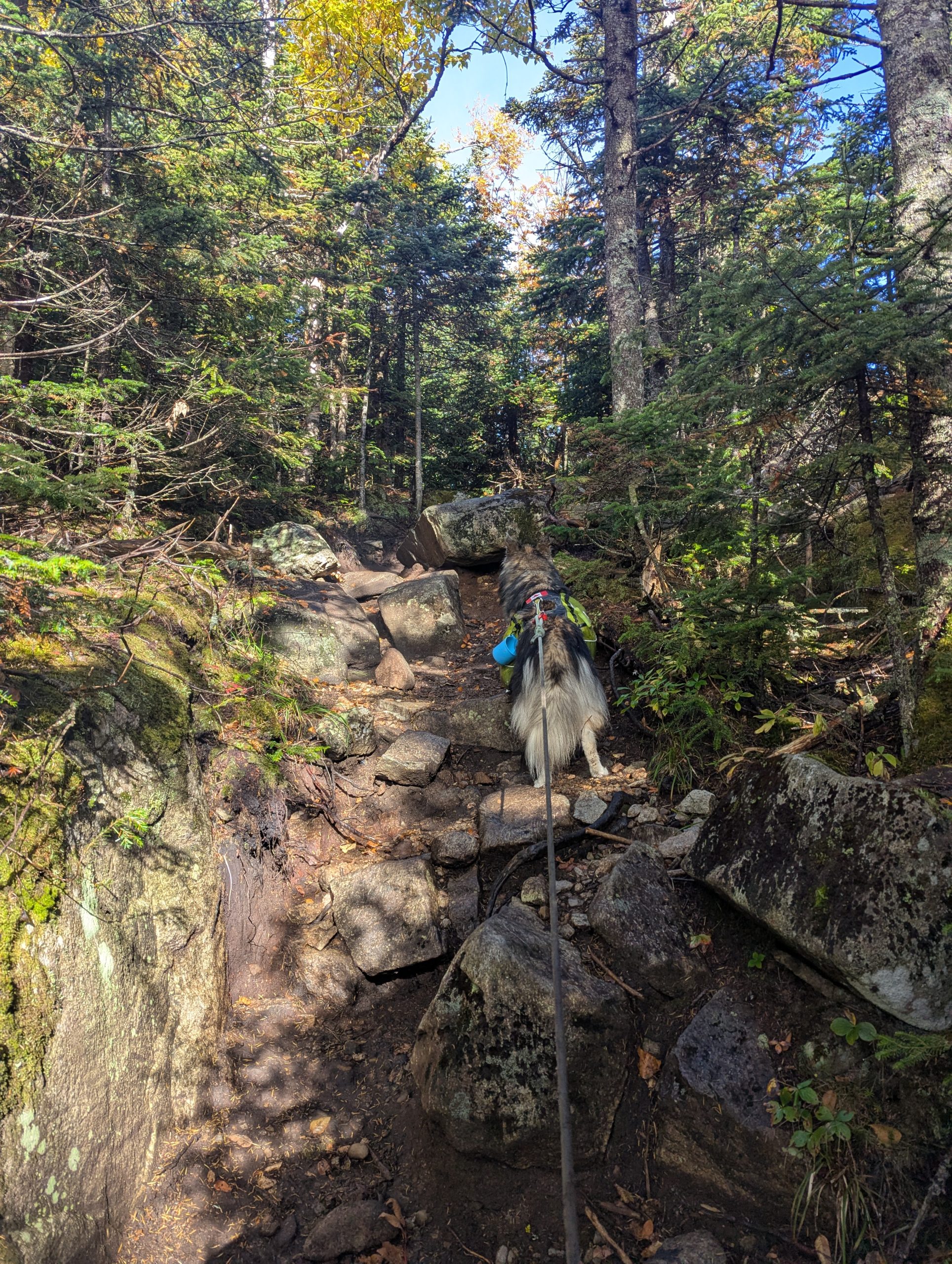 Once back at the junction we turned uphill towards Whiteface, had an interesting time getting around some blow down but soon enough we began crossing cut areas where the resort has cut up and across the trail, then passed the top end of one of the chair lifts before heading back into stacked boulders. Jasper isn’t a fan of this kind of terrain but with some boosts he made it through until we passed under the embankment for the toll road. We decided to take the road around the final section.