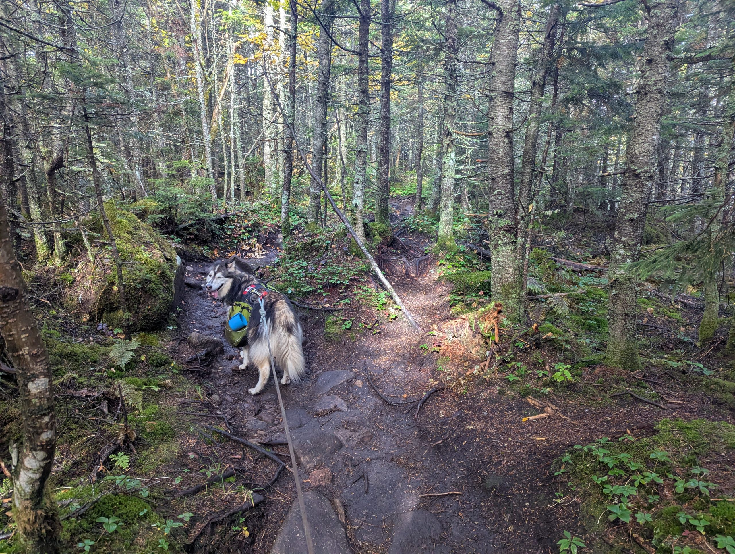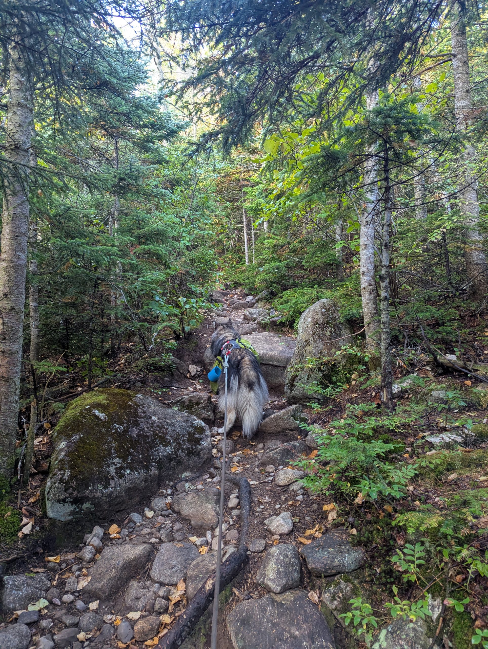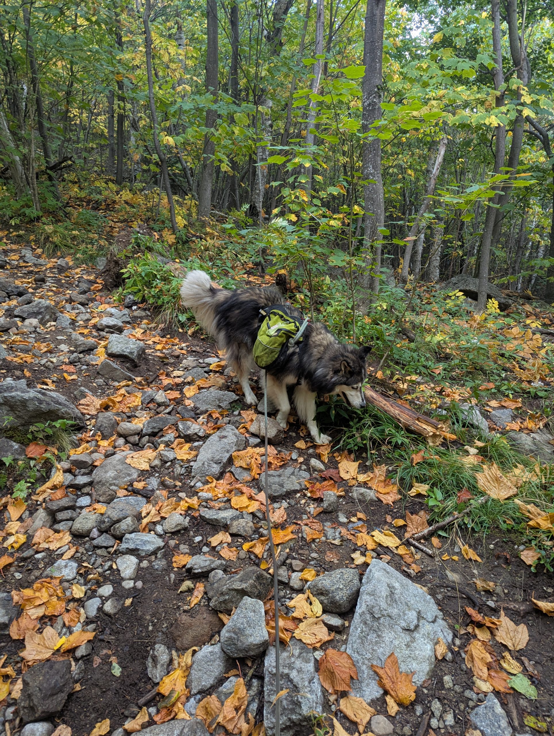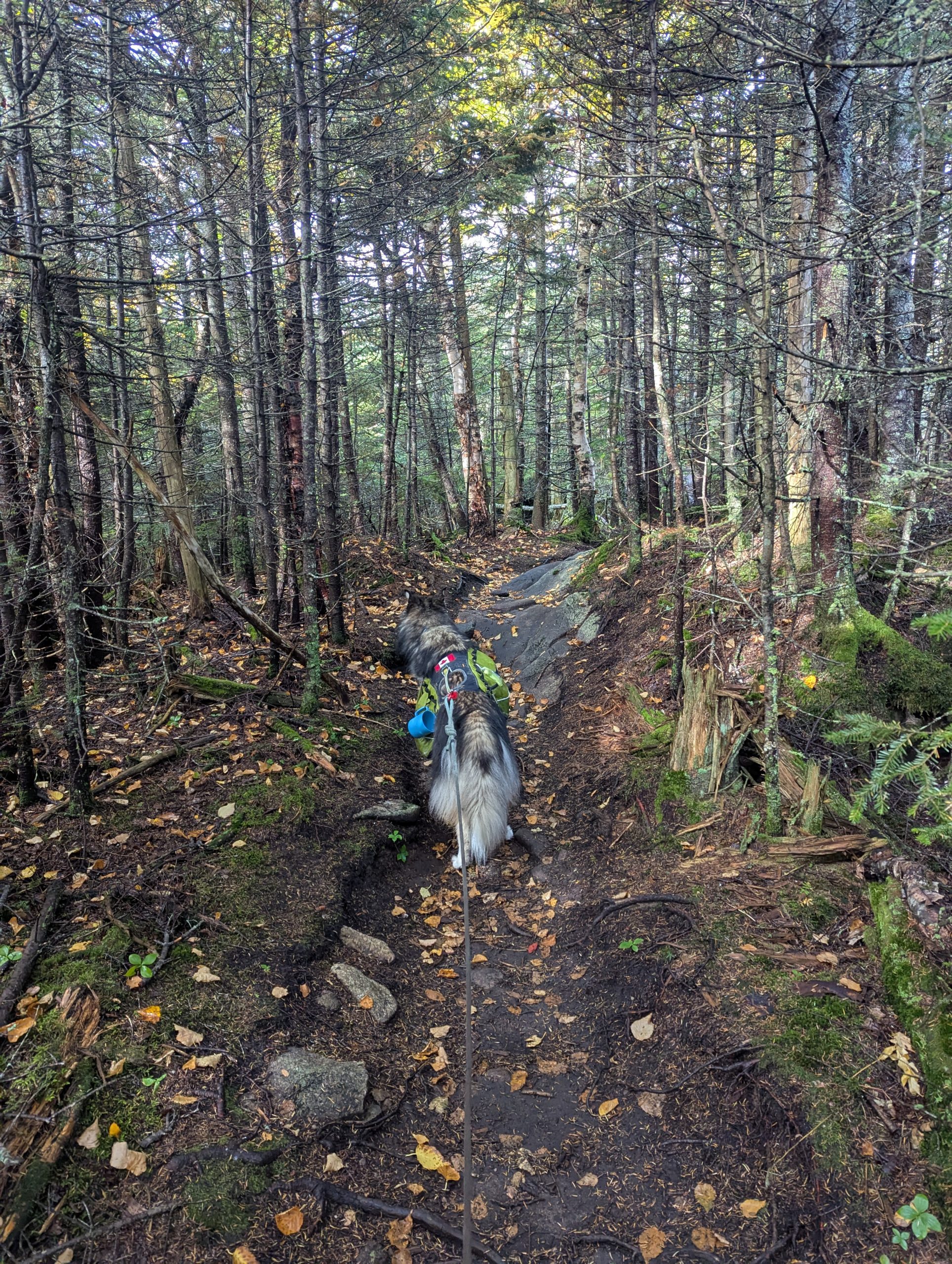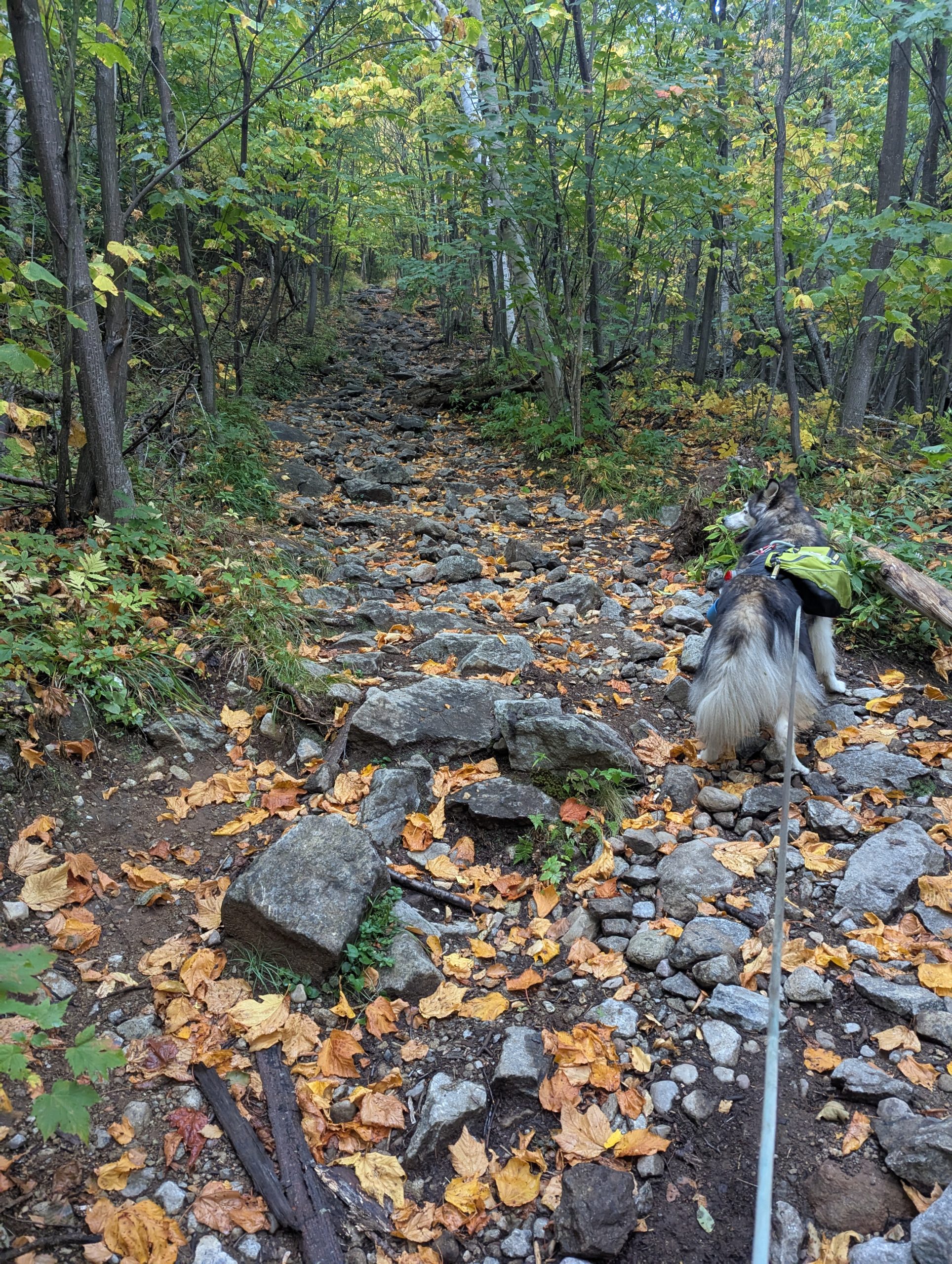 Once back at the junction we turned uphill towards Whiteface, had an interesting time getting around some blow down but soon enough we began crossing cut areas where the resort has cut up and across the trail, then passed the top end of one of the chair lifts before heading back into stacked boulders. Jasper isn’t a fan of this kind of terrain but with some boosts he made it through until we passed under the embankment for the toll road. We decided to take the road around the final section.