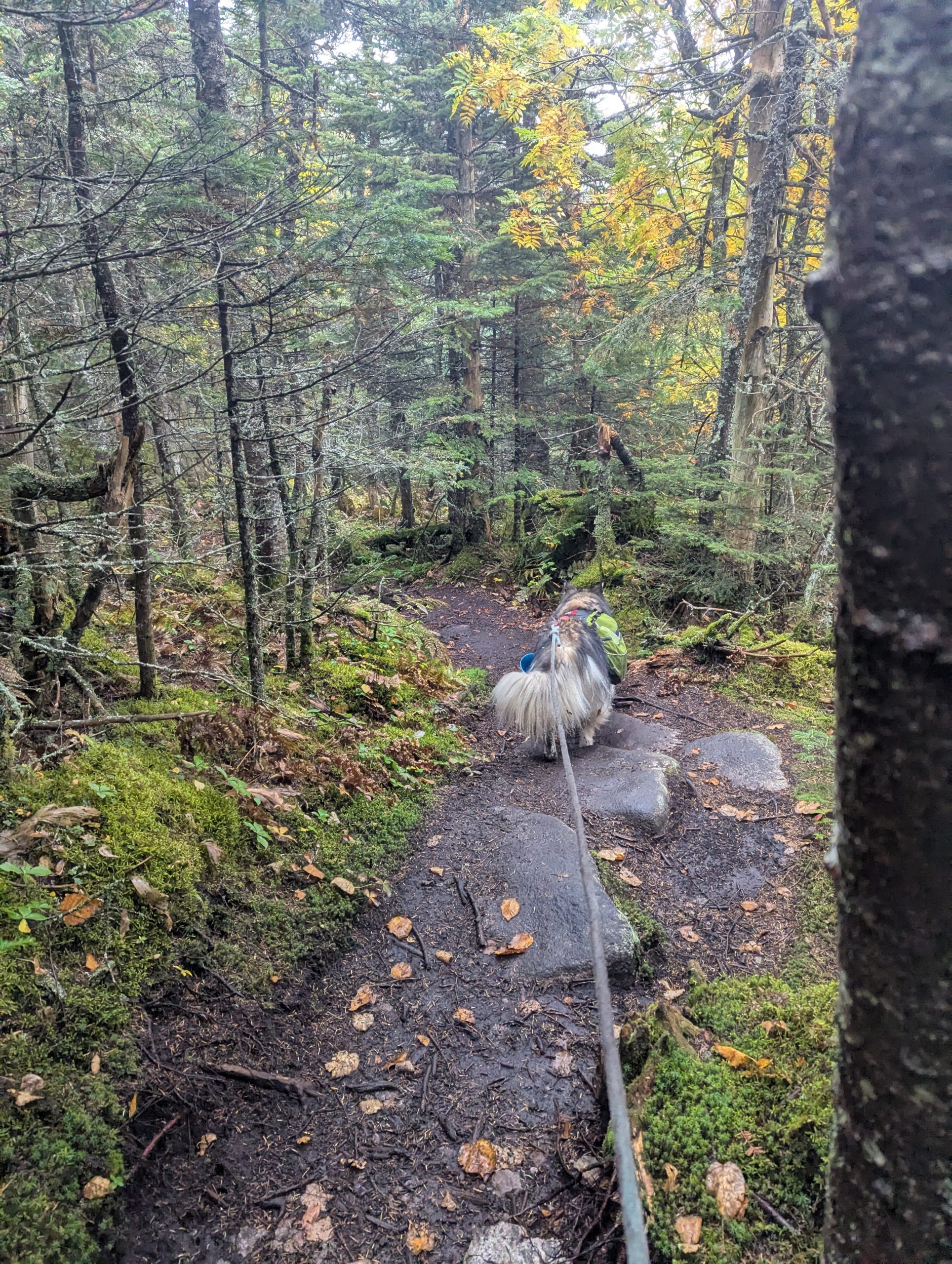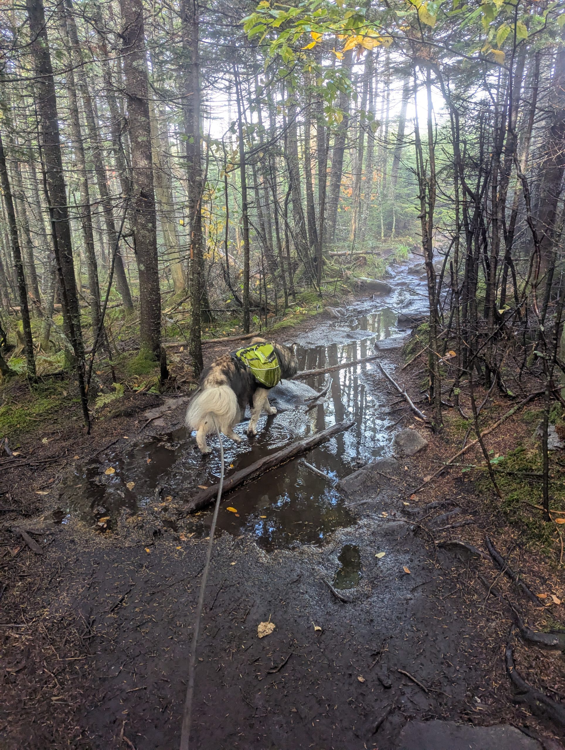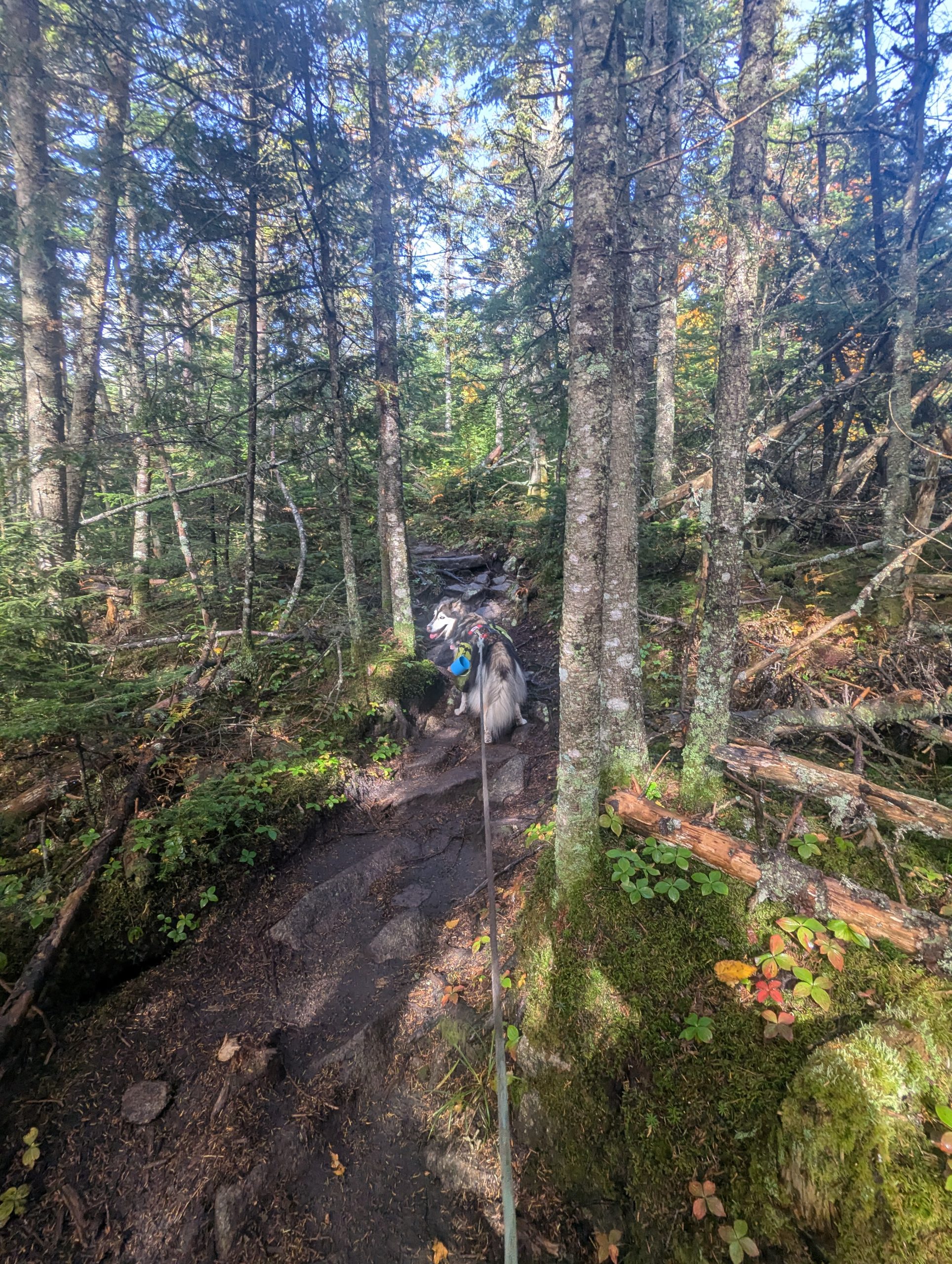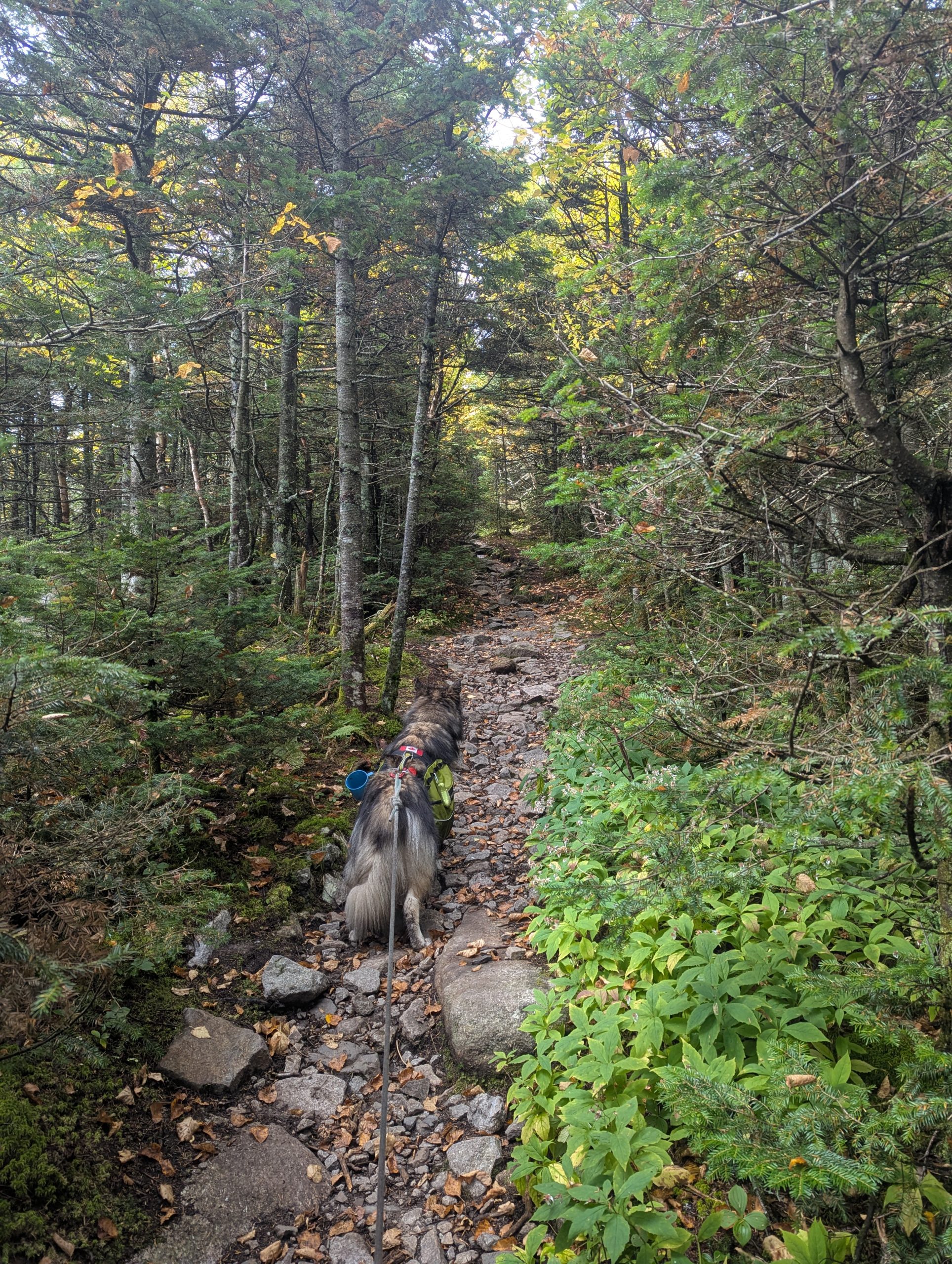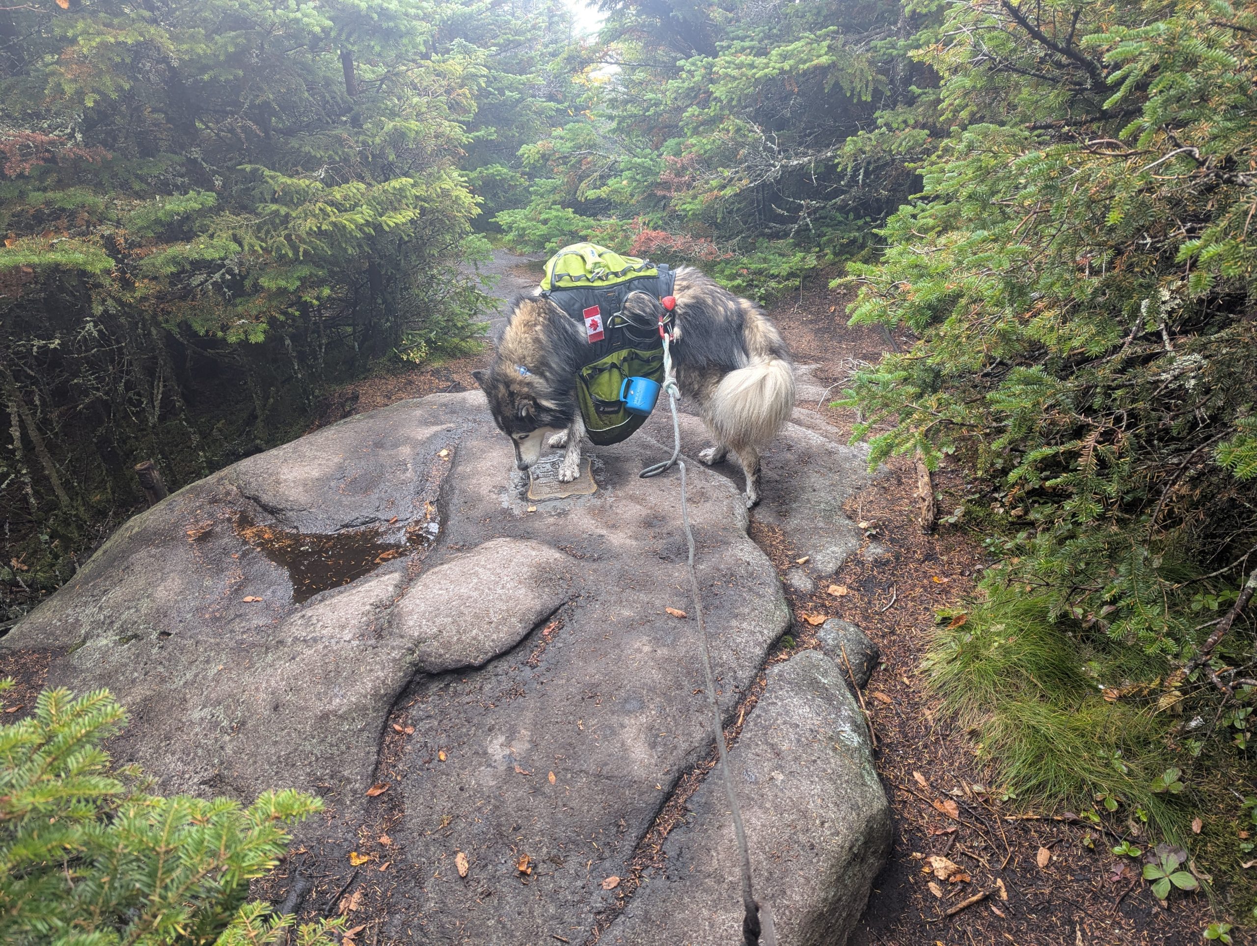 Once back at the junction we turned uphill towards Whiteface, had an interesting time getting around some blow down but soon enough we began crossing cut areas where the resort has cut up and across the trail, then passed the top end of one of the chair lifts before heading back into stacked boulders. Jasper isn’t a fan of this kind of terrain but with some boosts he made it through until we passed under the embankment for the toll road. We decided to take the road around the final section.
