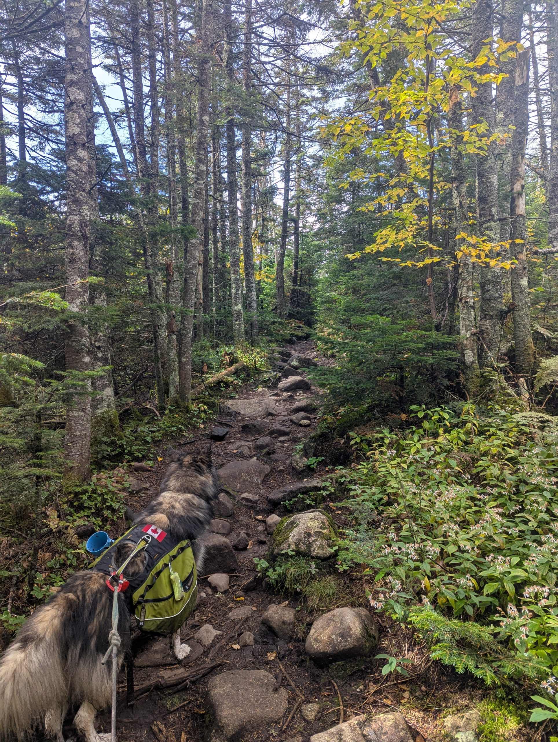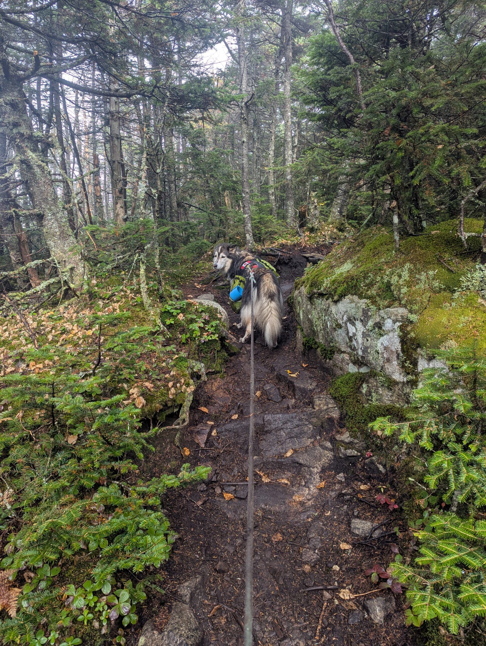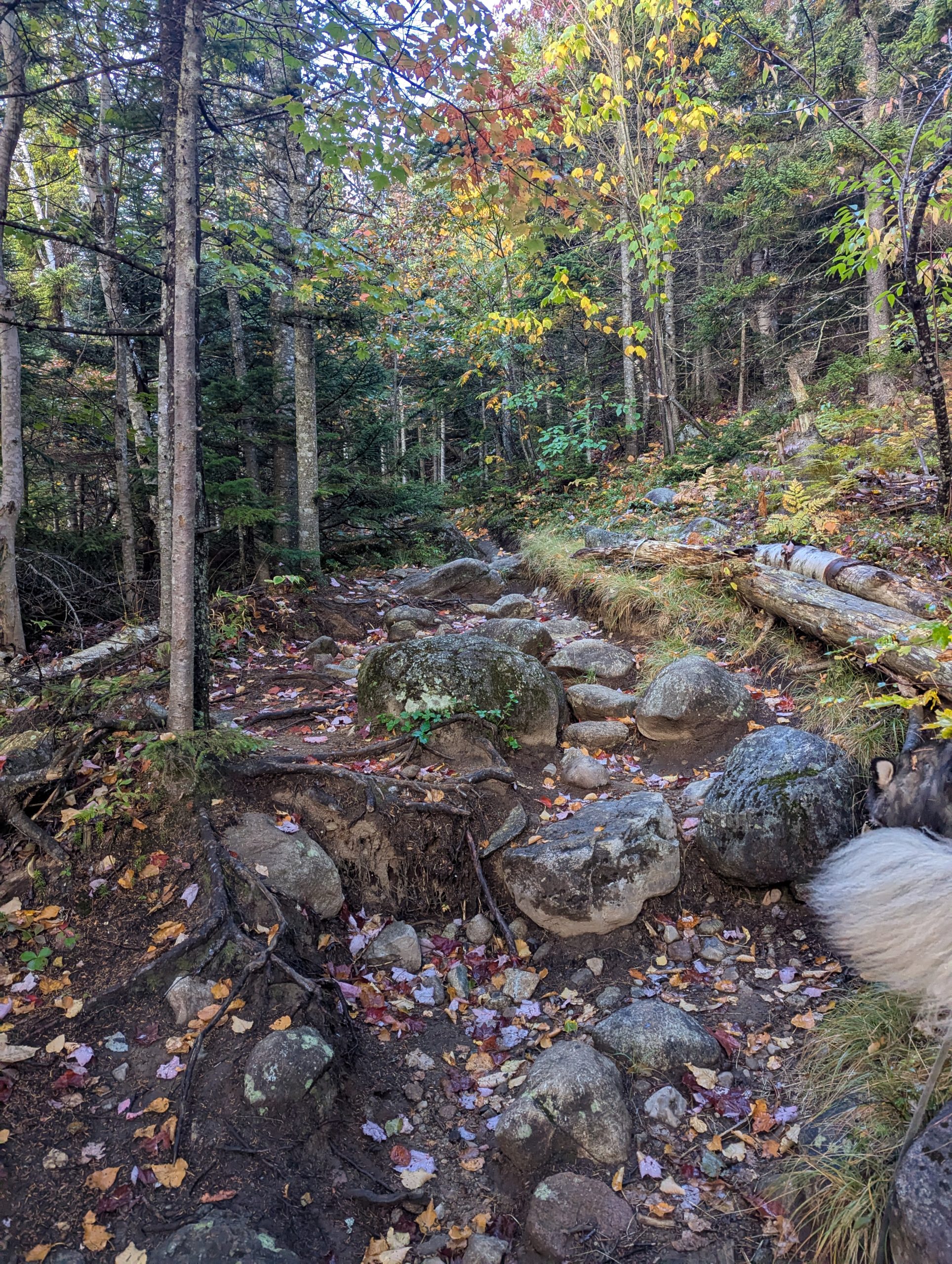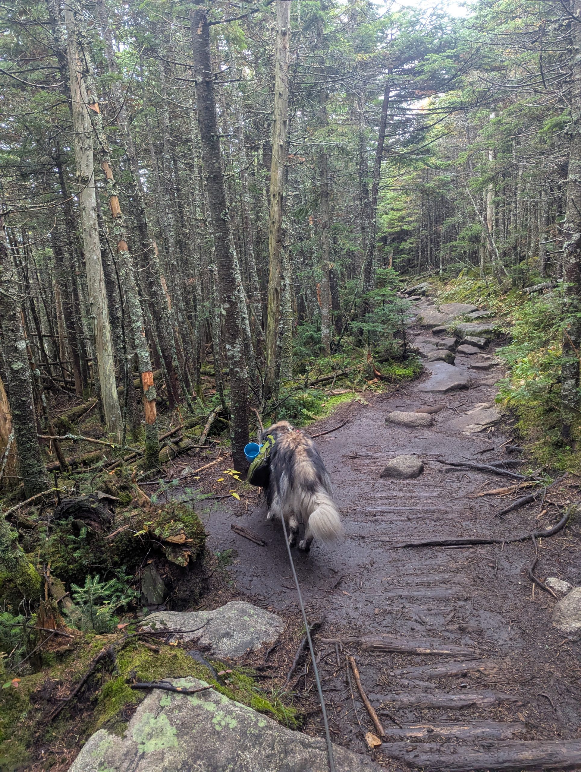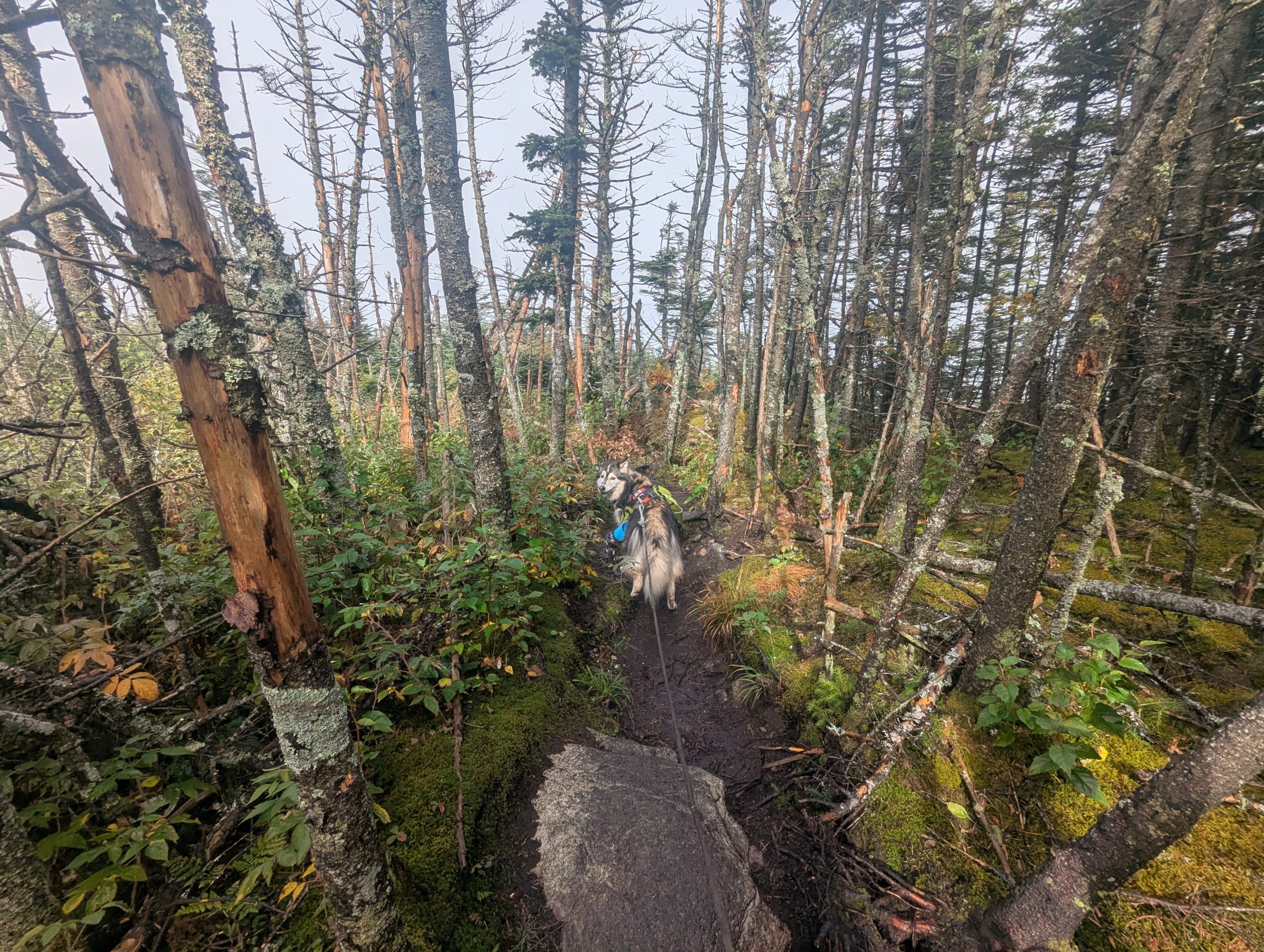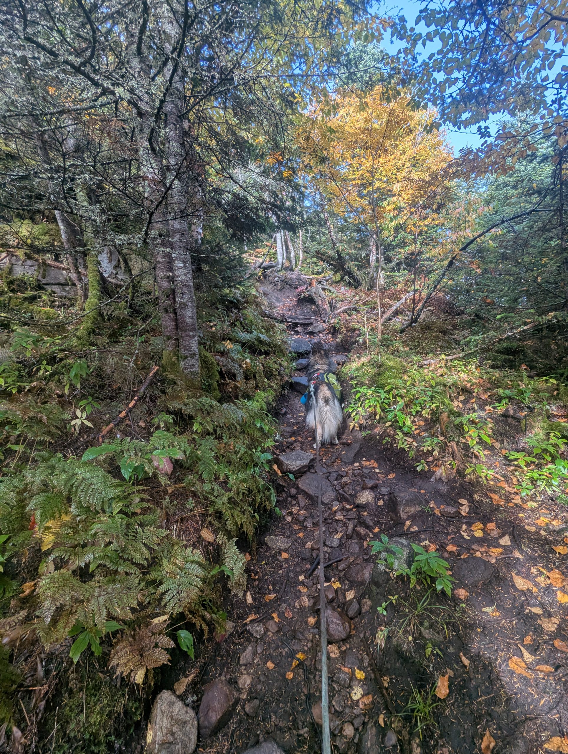Once back at the junction we turned uphill towards Whiteface, had an interesting time getting around some blow down but soon enough we began crossing cut areas where the resort has cut up and across the trail, then passed the top end of one of the chair lifts before heading back into stacked boulders. Jasper isn’t a fan of this kind of terrain but with some boosts he made it through until we passed under the embankment for the toll road. We decided to take the road around the final section.