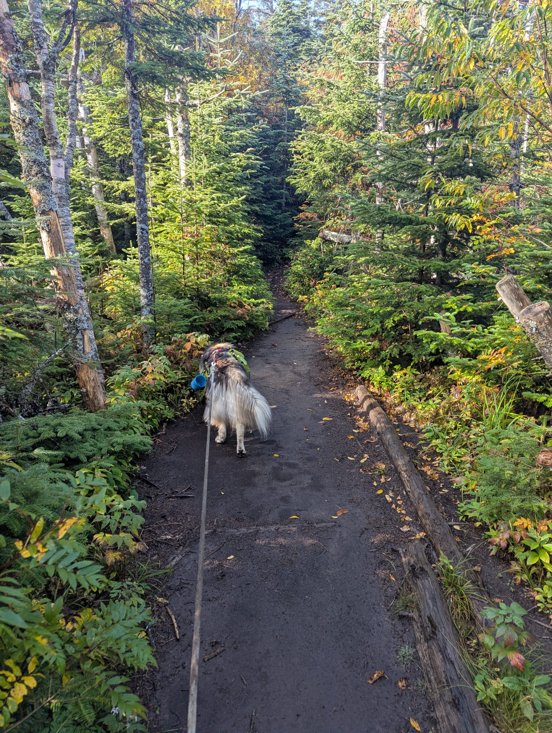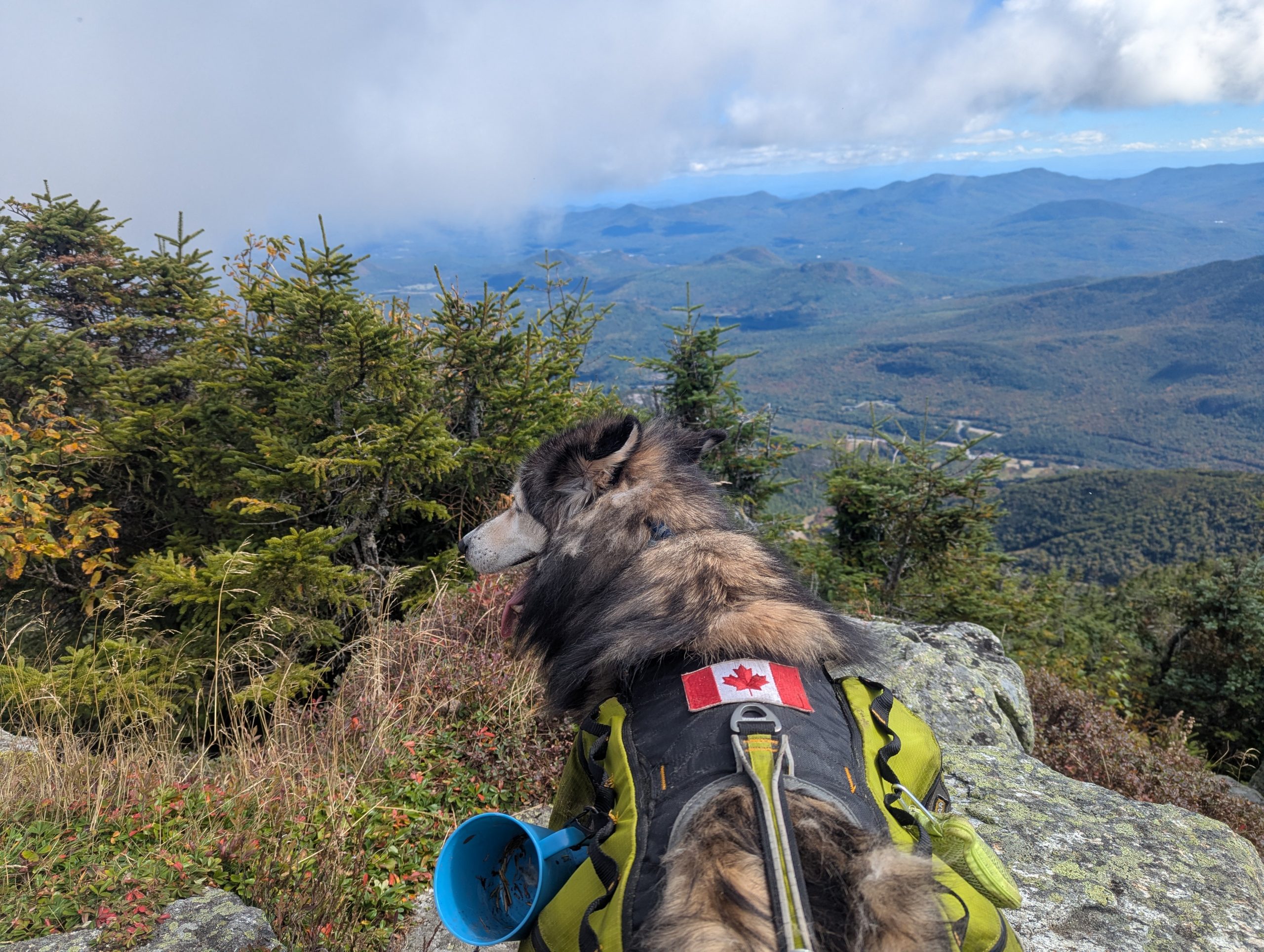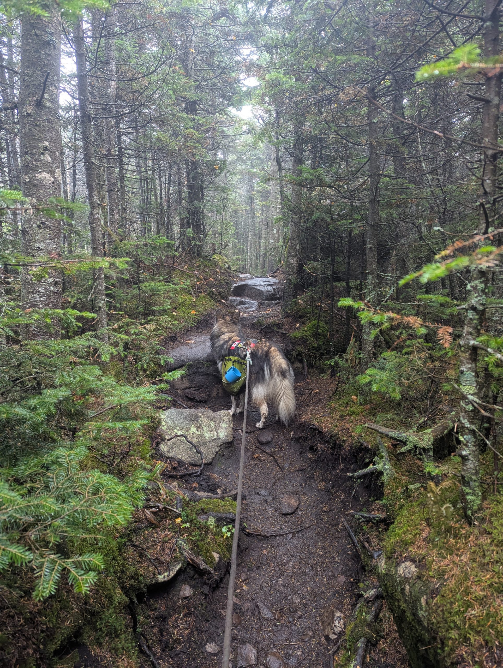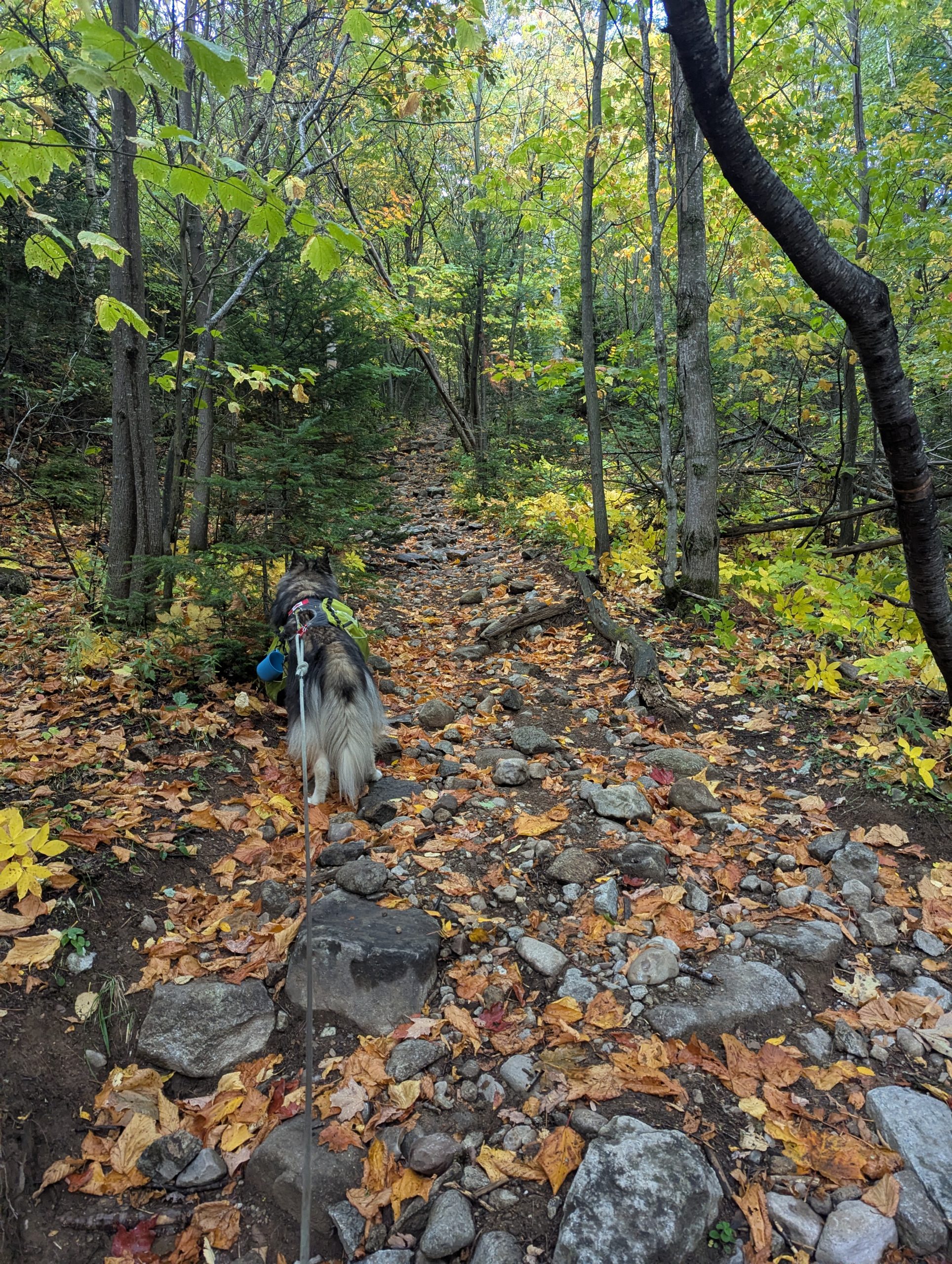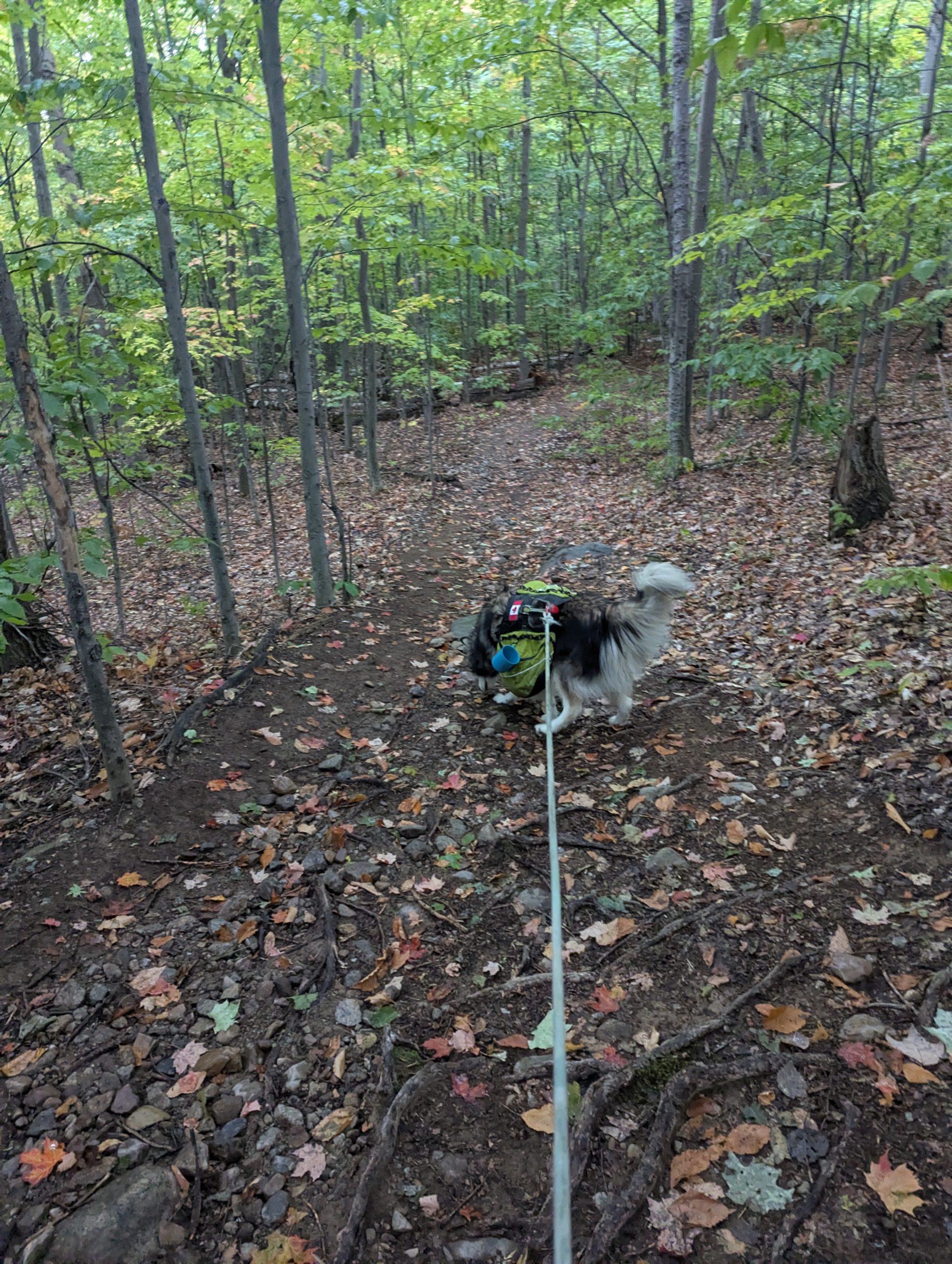 Once back at the junction we turned uphill towards Whiteface, had an interesting time getting around some blow down but soon enough we began crossing cut areas where the resort has cut up and across the trail, then passed the top end of one of the chair lifts before heading back into stacked boulders. Jasper isn’t a fan of this kind of terrain but with some boosts he made it through until we passed under the embankment for the toll road. We decided to take the road around the final section.
