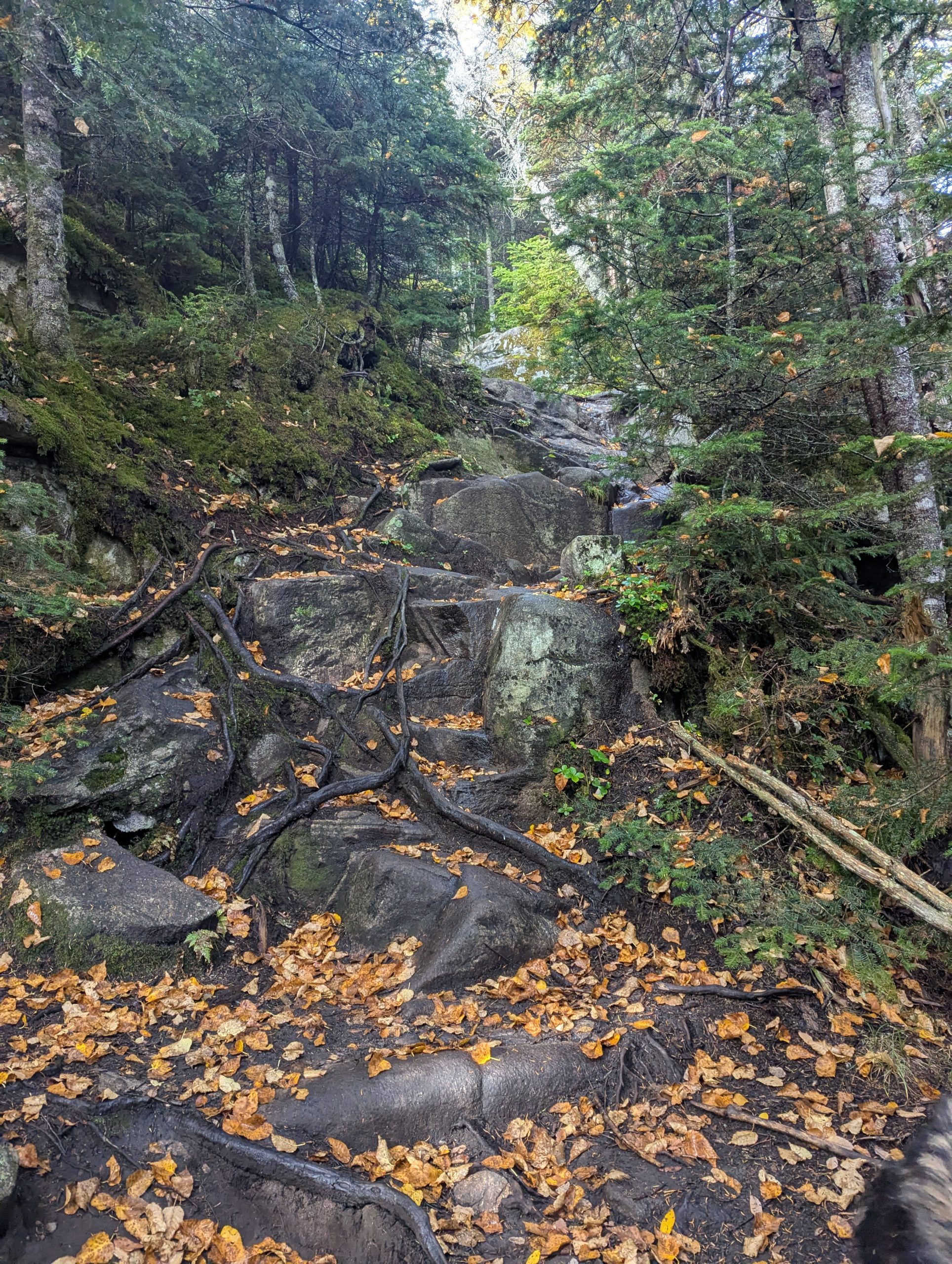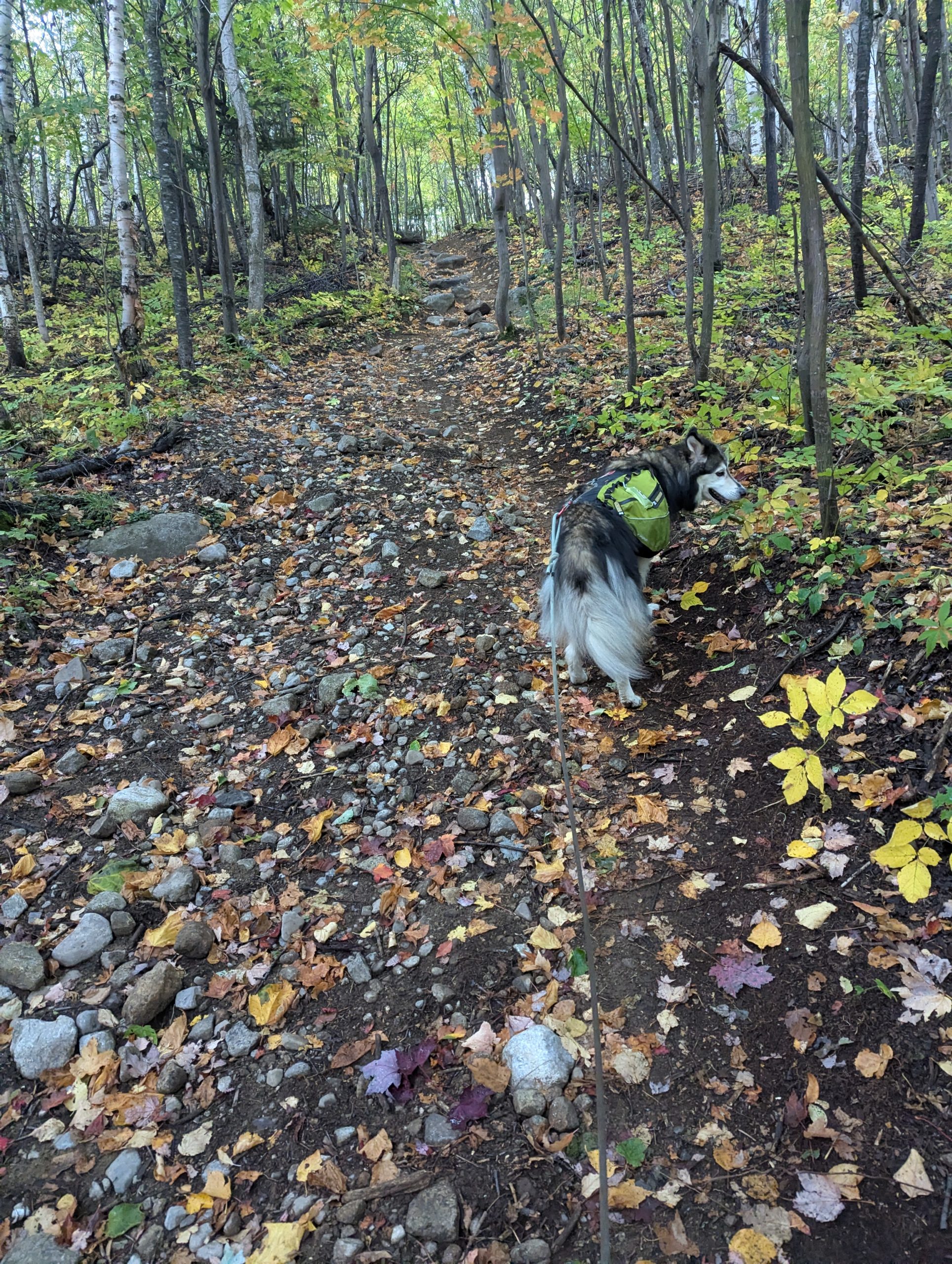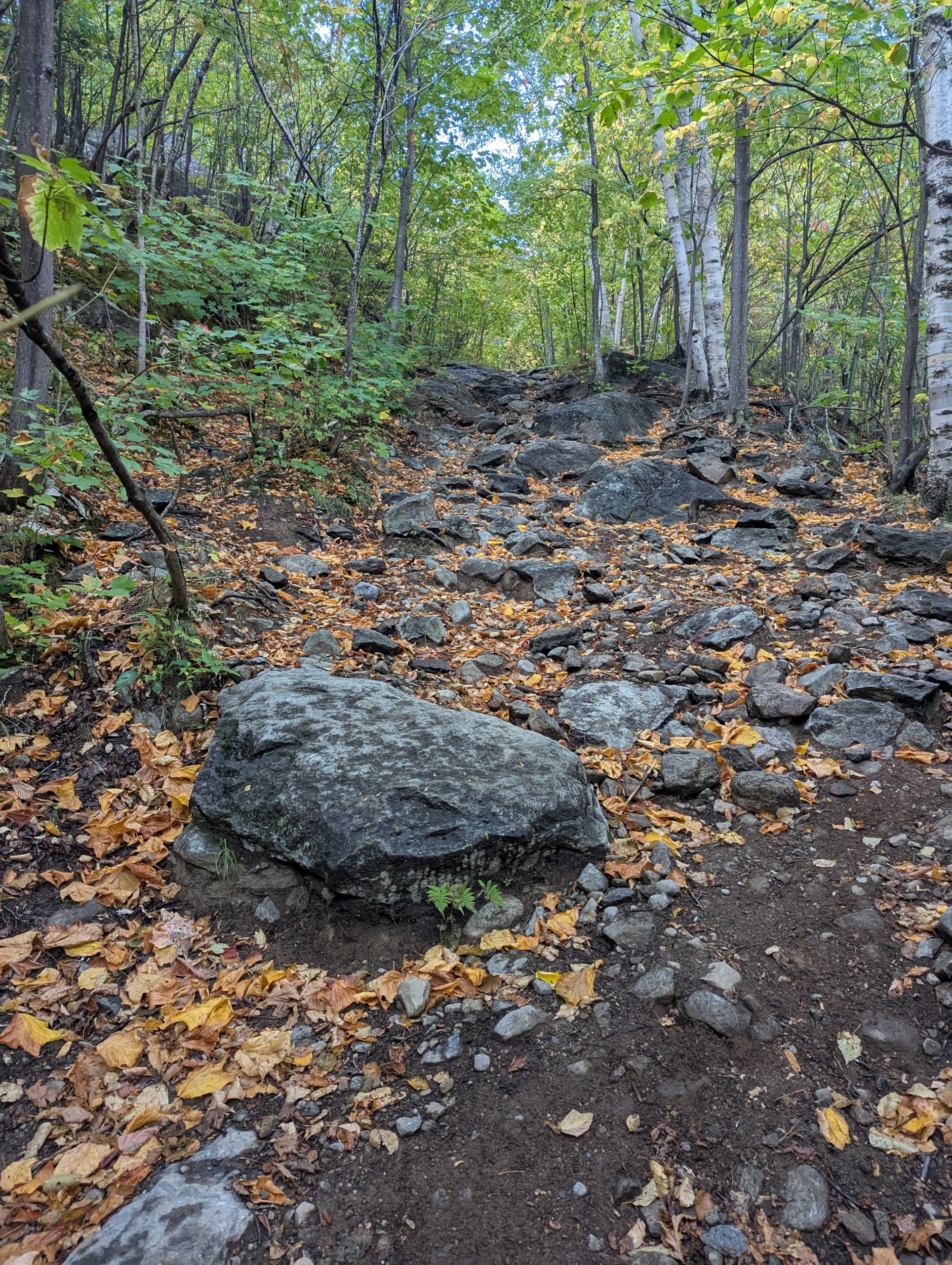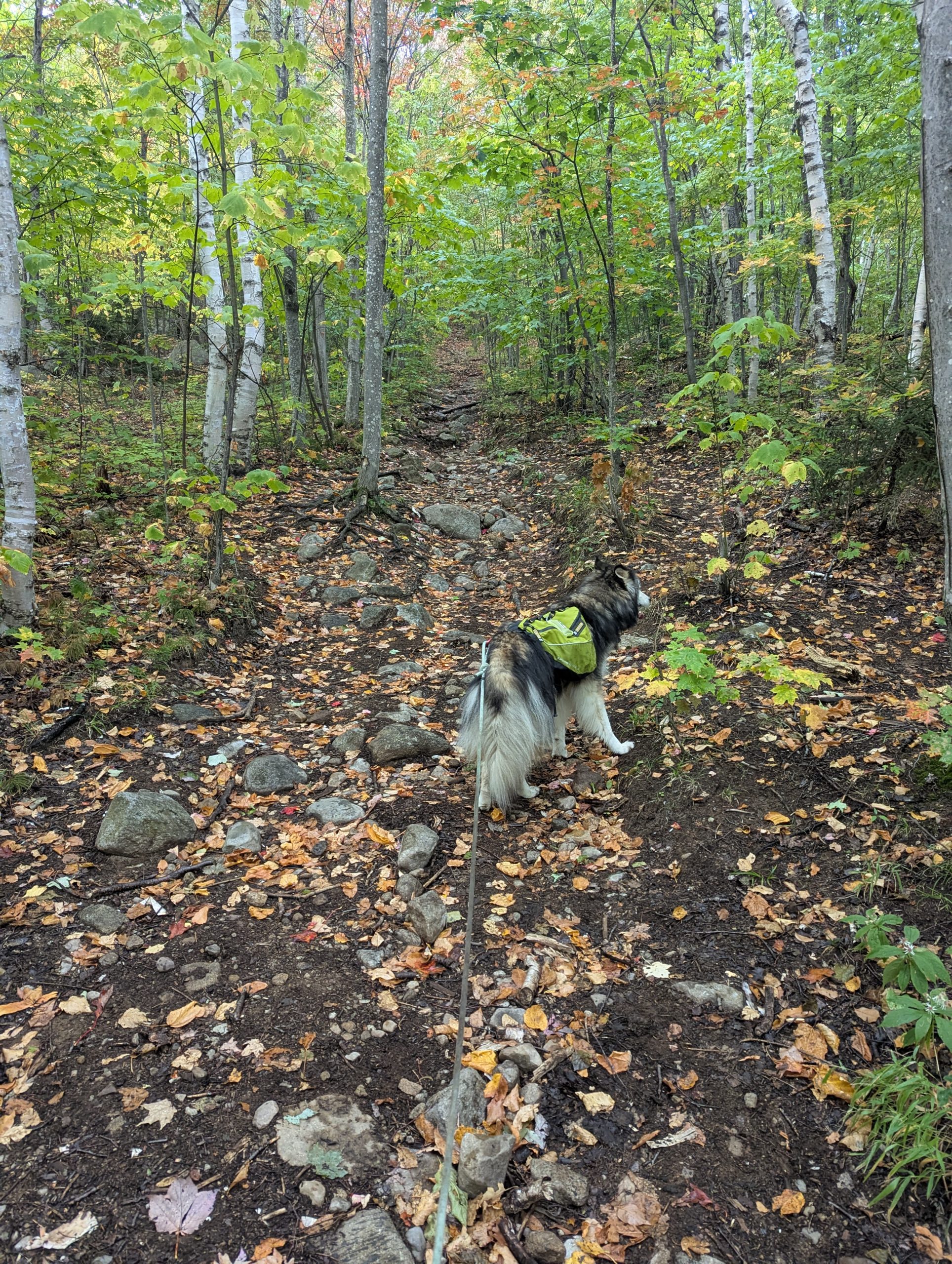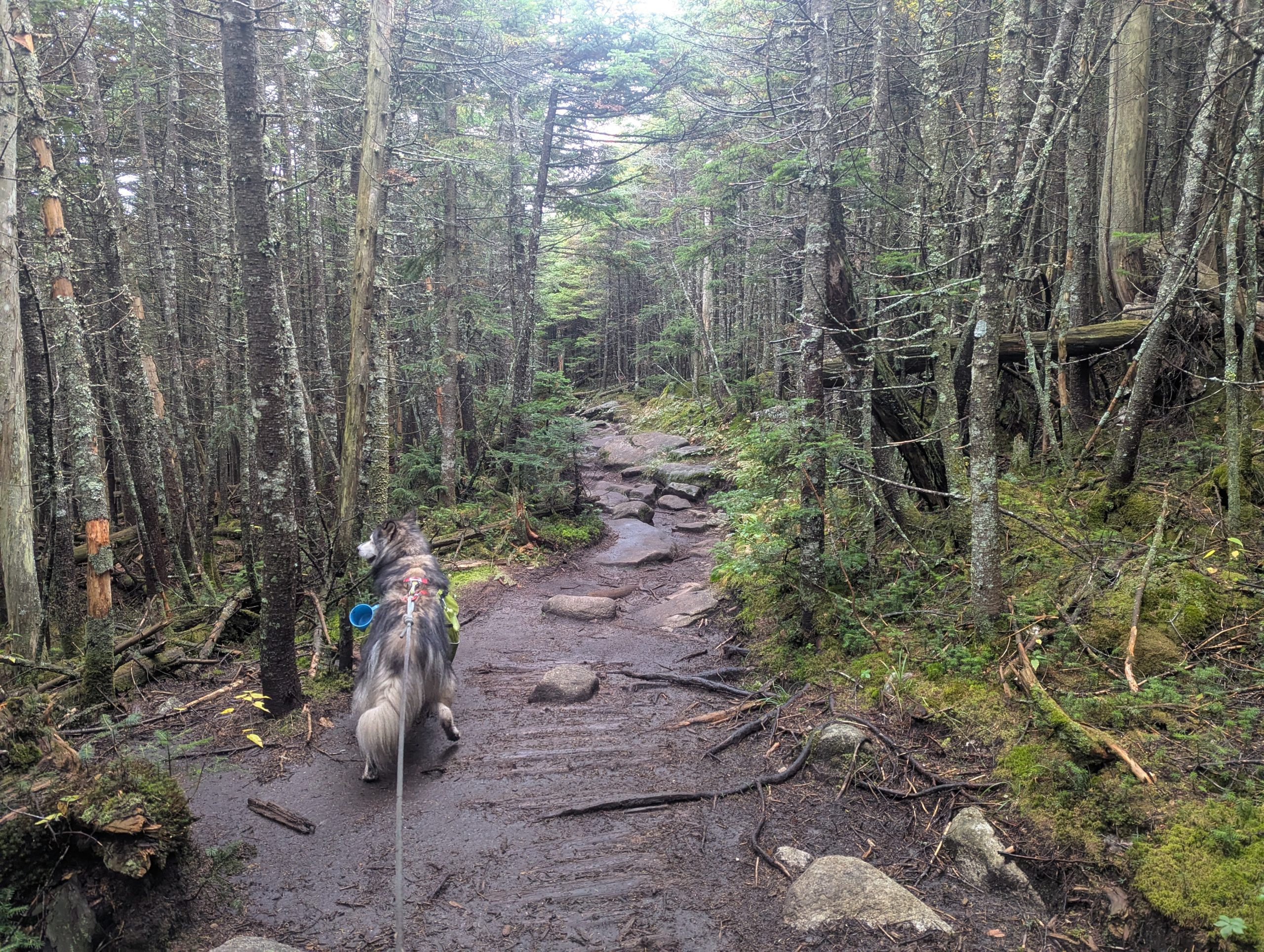 Once back at the junction we turned uphill towards Whiteface, had an interesting time getting around some blow down but soon enough we began crossing cut areas where the resort has cut up and across the trail, then passed the top end of one of the chair lifts before heading back into stacked boulders. Jasper isn’t a fan of this kind of terrain but with some boosts he made it through until we passed under the embankment for the toll road. We decided to take the road around the final section.