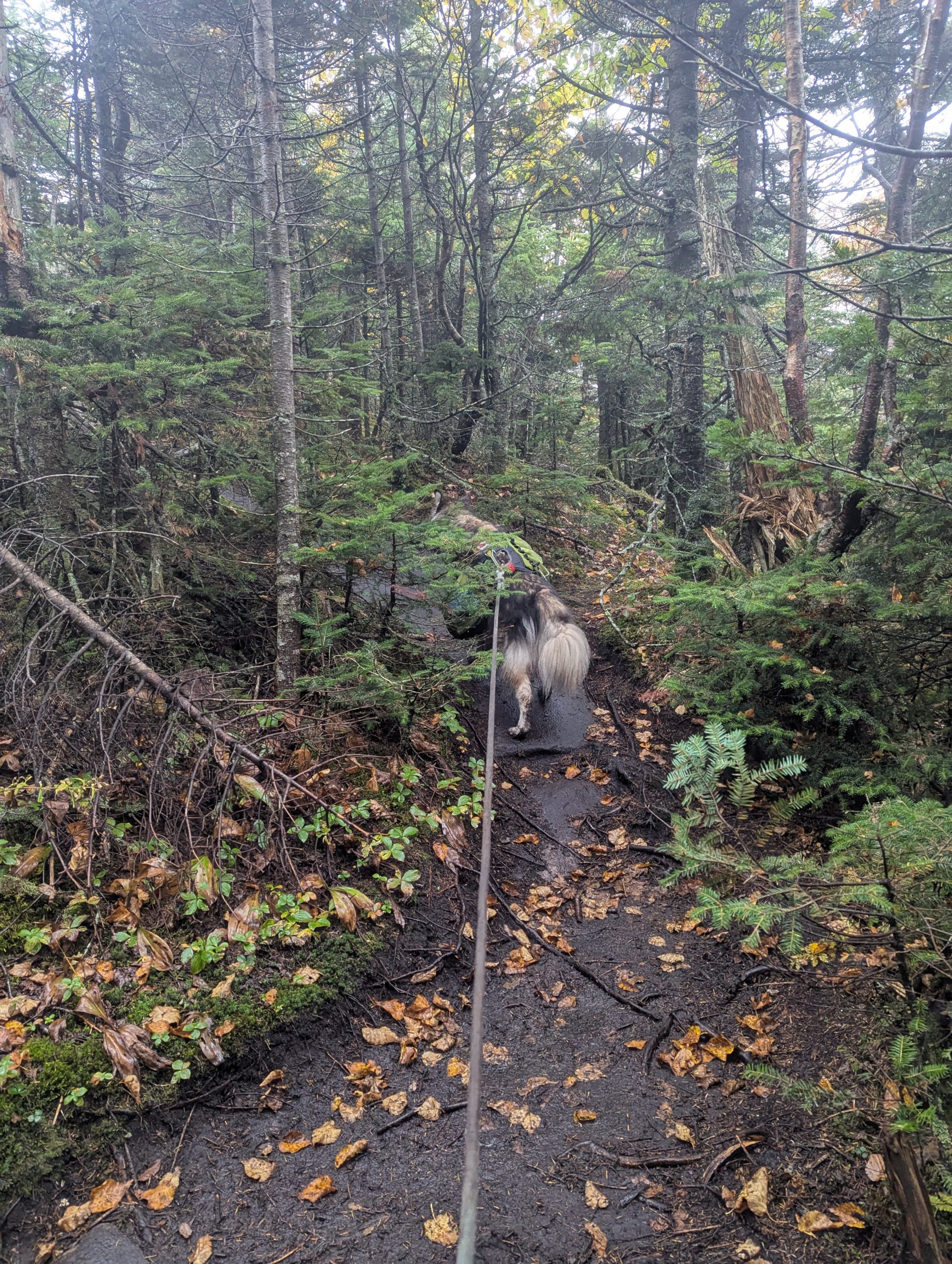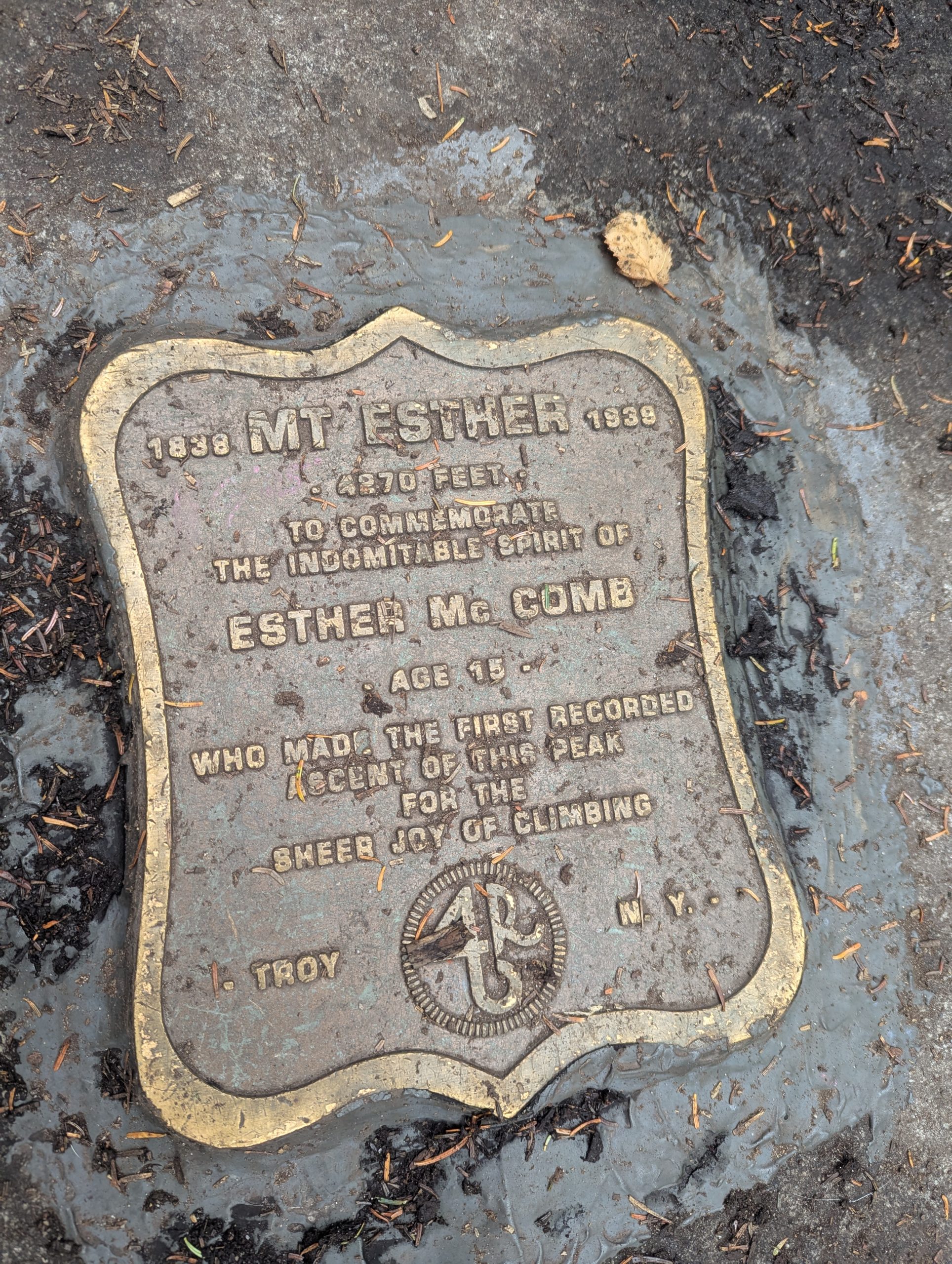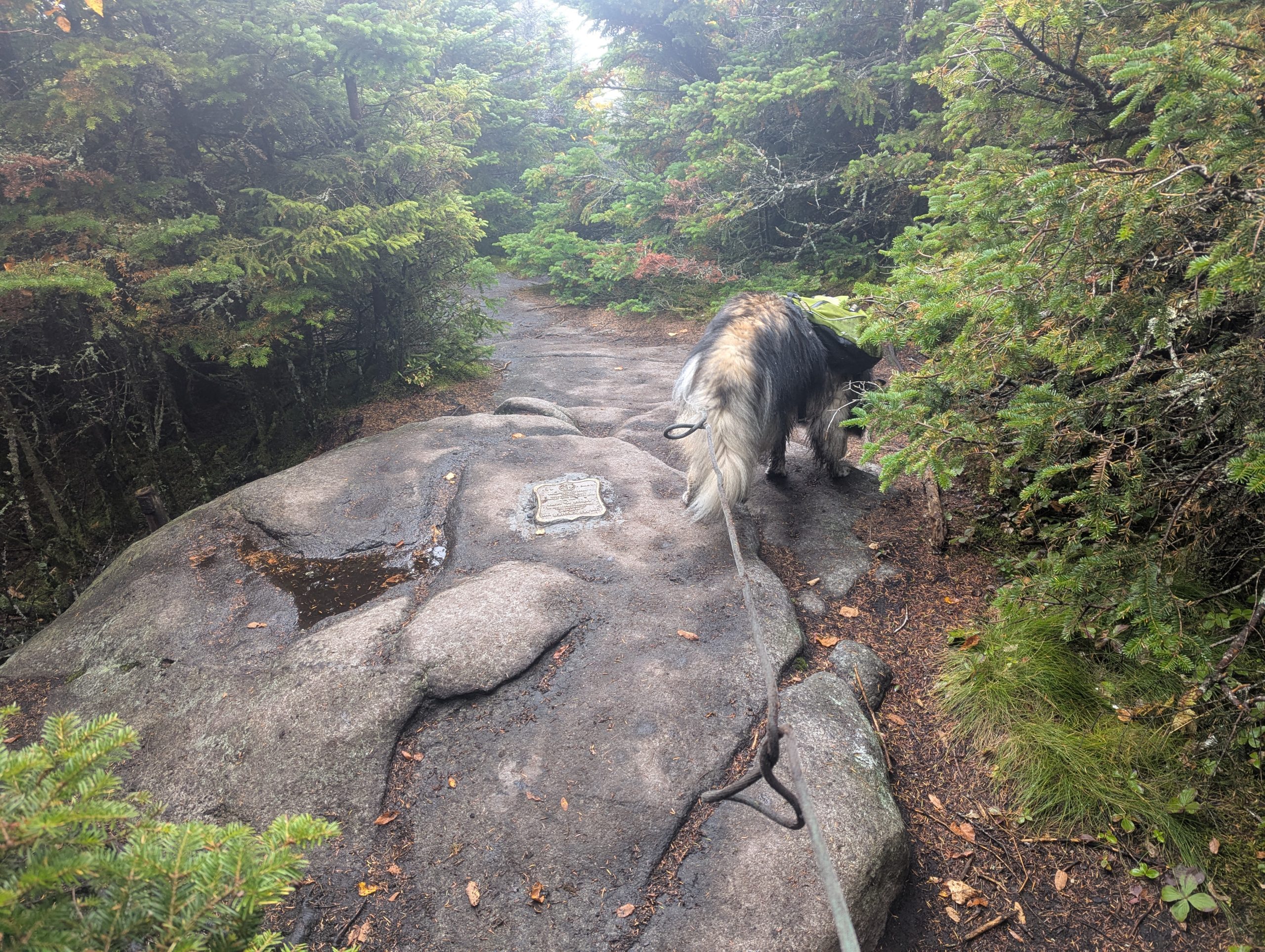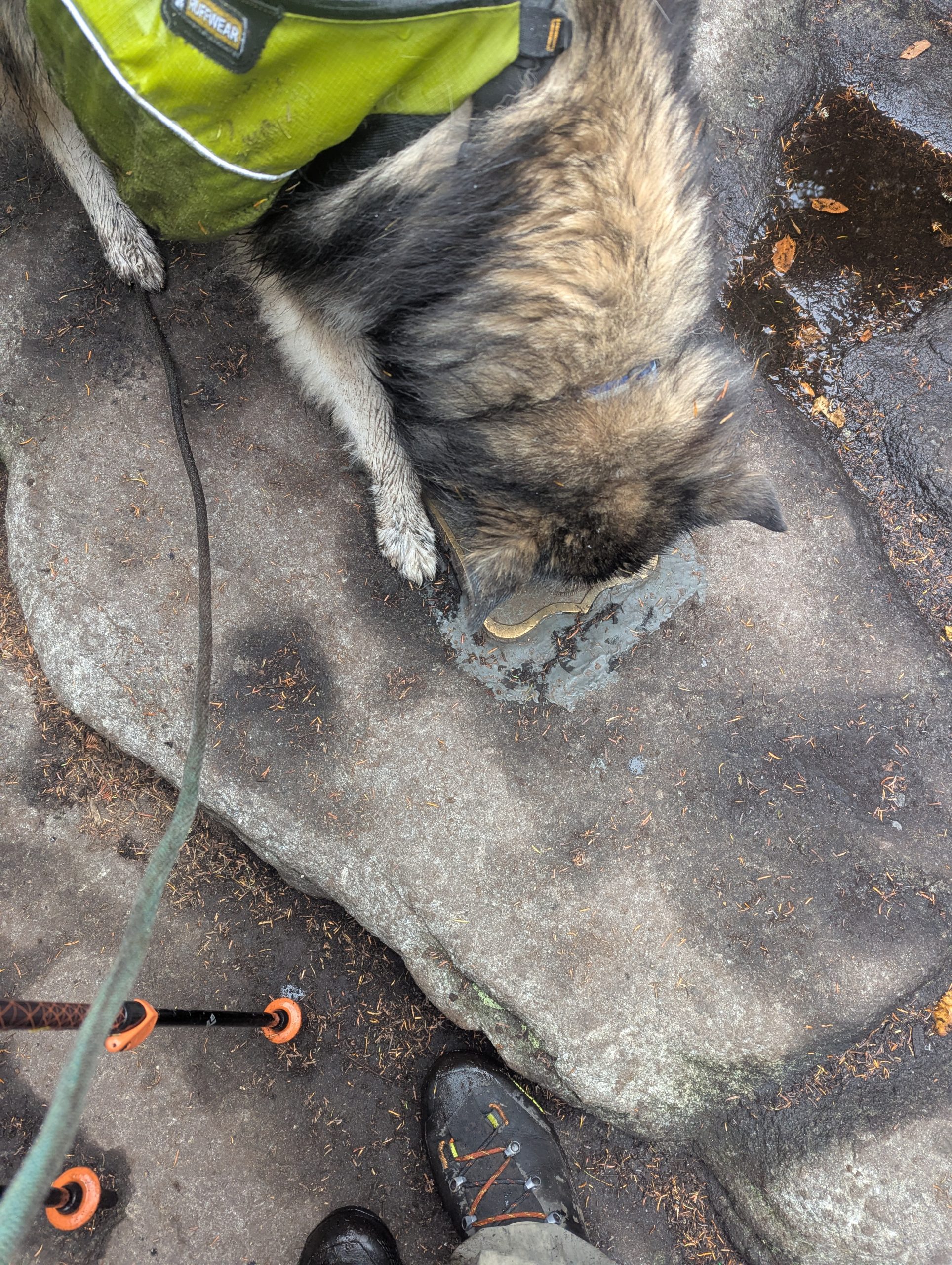 We reached the turn-off to the herd path to the summit of Esther, it wasn’t difficult terrain but it did get muddy in places and required a fair number of minor detours around good sized mud pits. Jasper, handled it without issue only occasionally trying to pull me the wrong way around or under a tree. Esther’s summit is enclosed without any views; Jasper found the plaque but refused to agree that this was the top of a mountain.