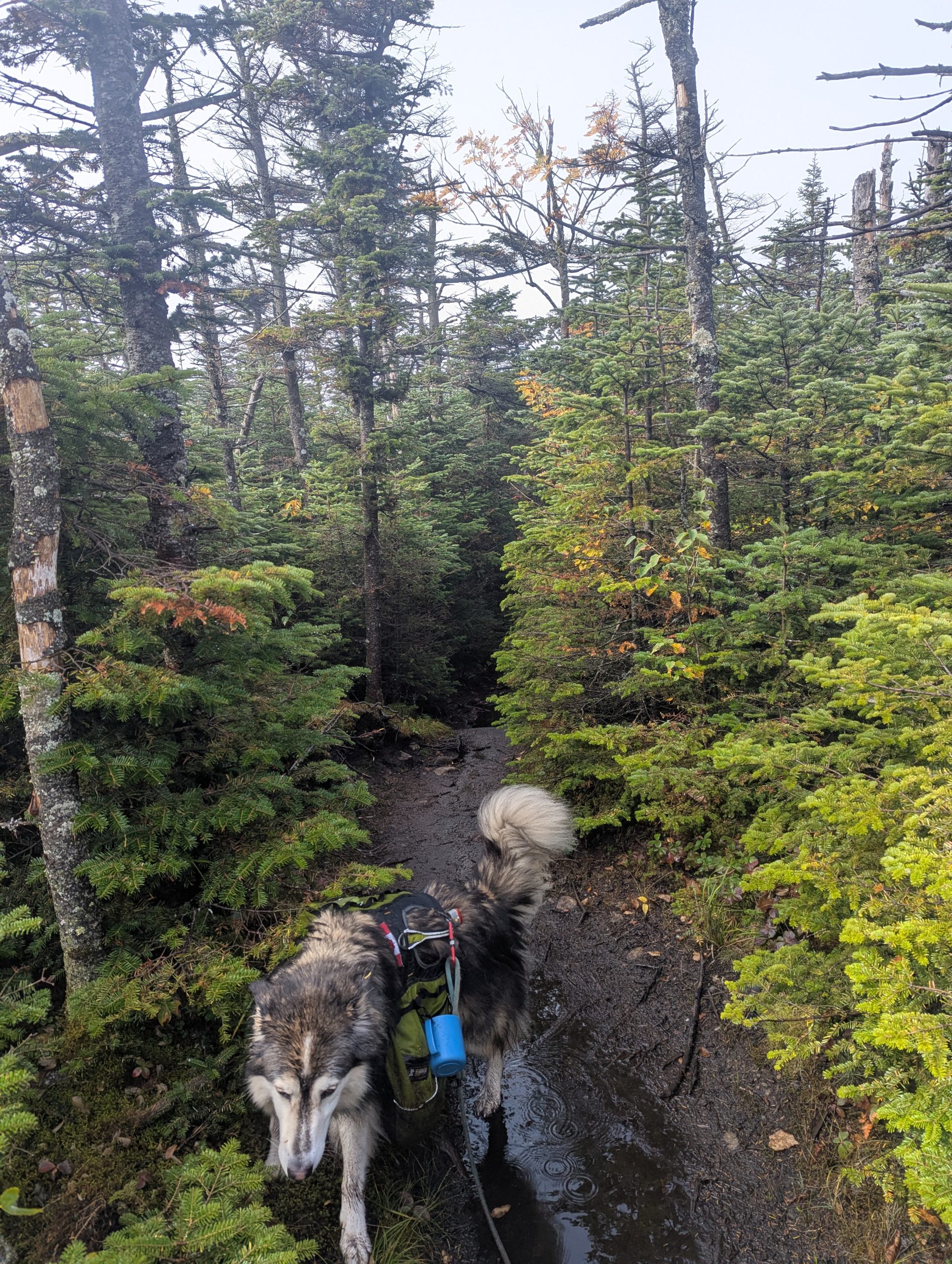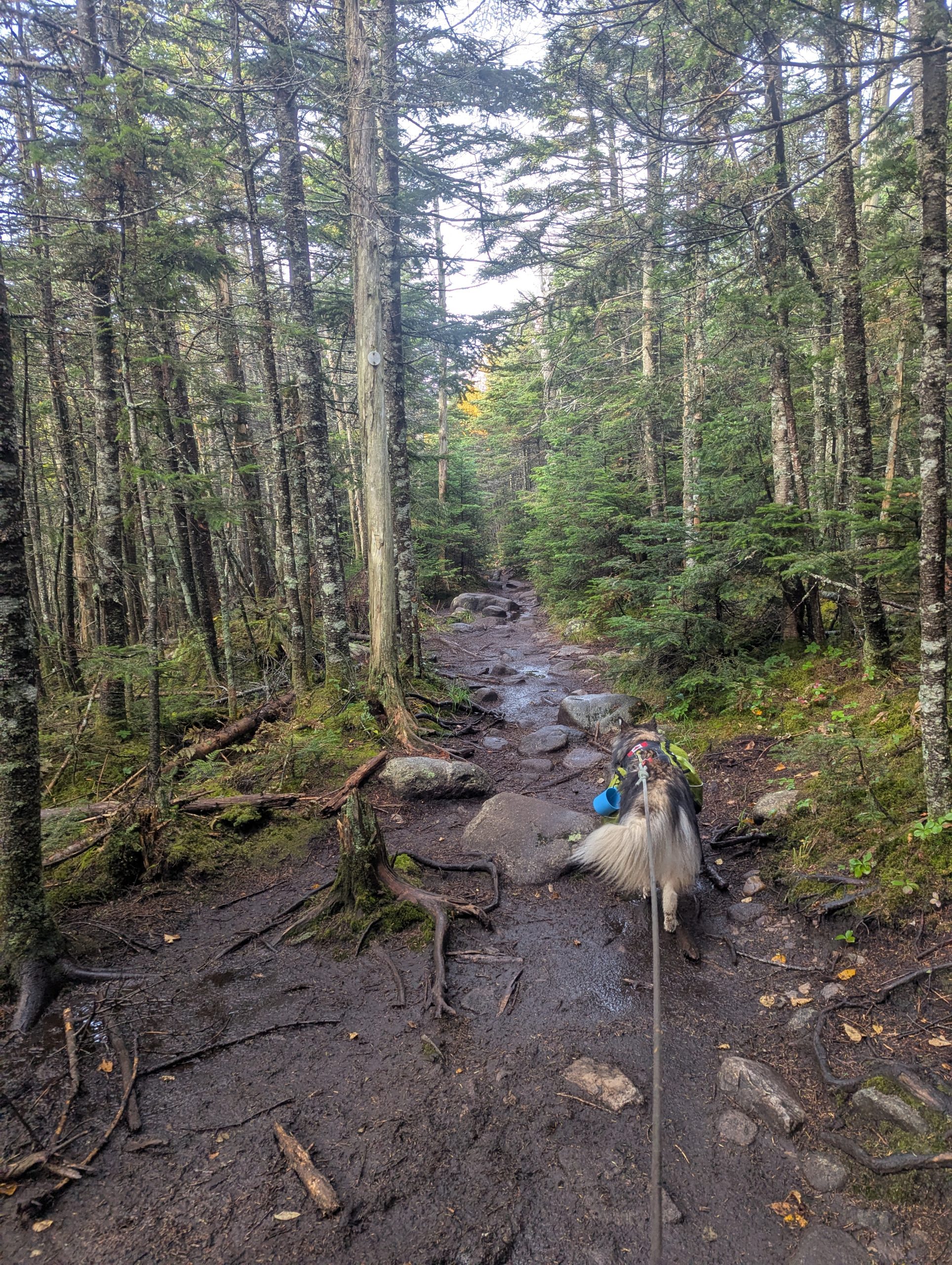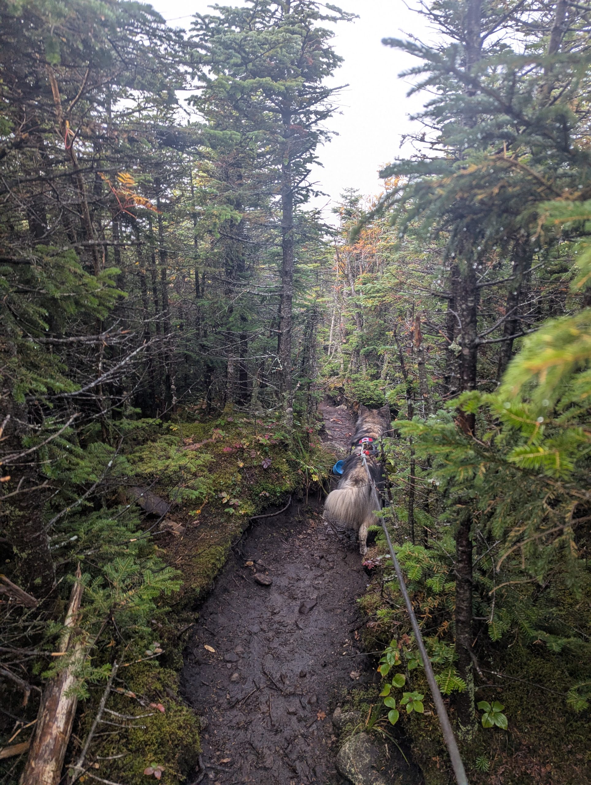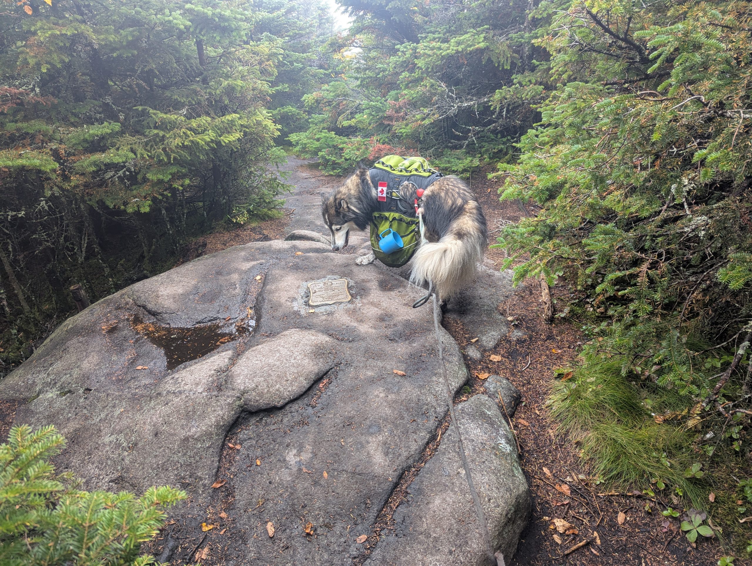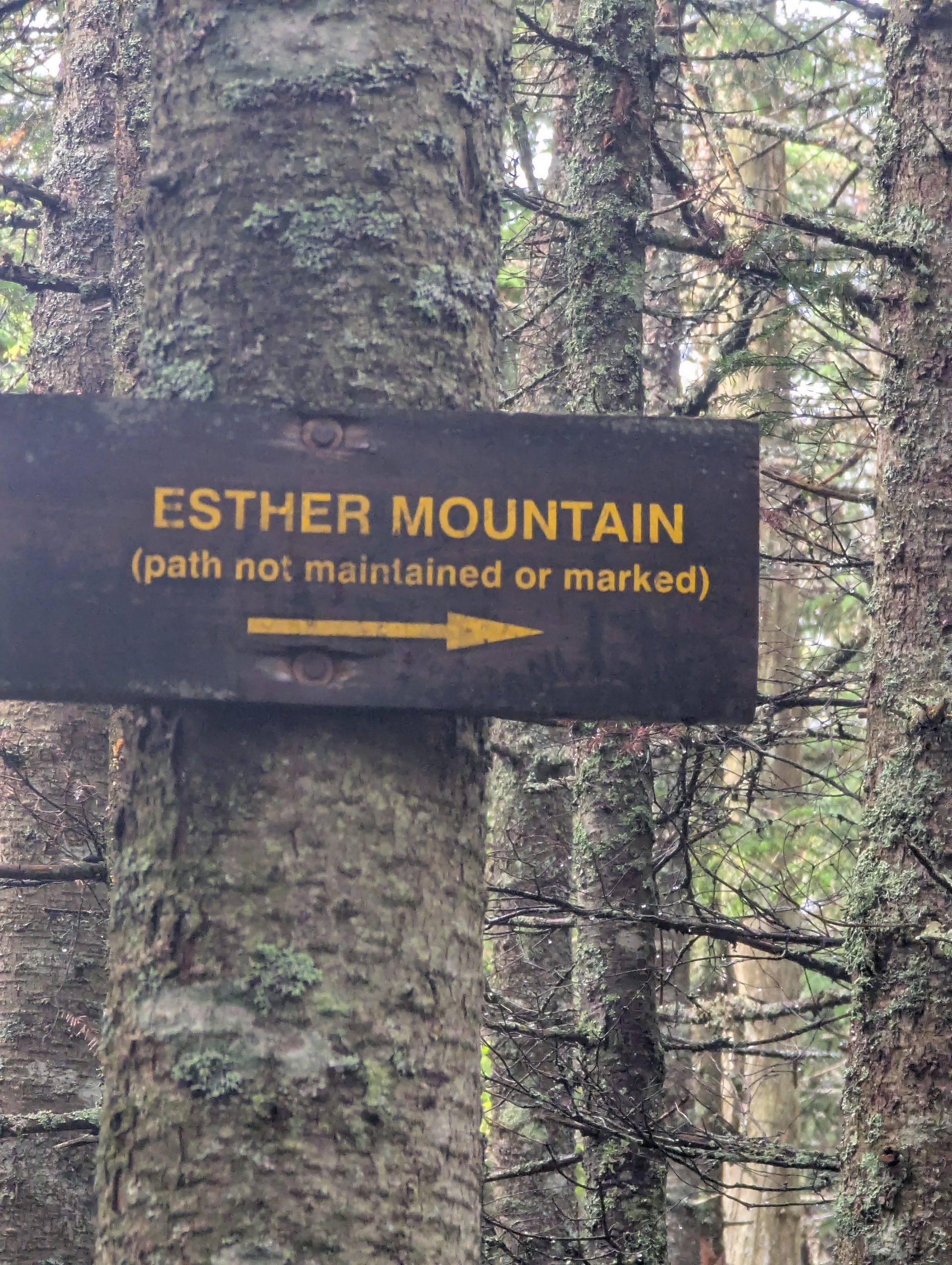We reached the turn-off to the herd path to the summit of Esther, it wasn’t difficult terrain but it did get muddy in places and required a fair number of minor detours around good sized mud pits. Jasper, handled it without issue only occasionally trying to pull me the wrong way around or under a tree. Esther’s summit is enclosed without any views; Jasper found the plaque but refused to agree that this was the top of a mountain.